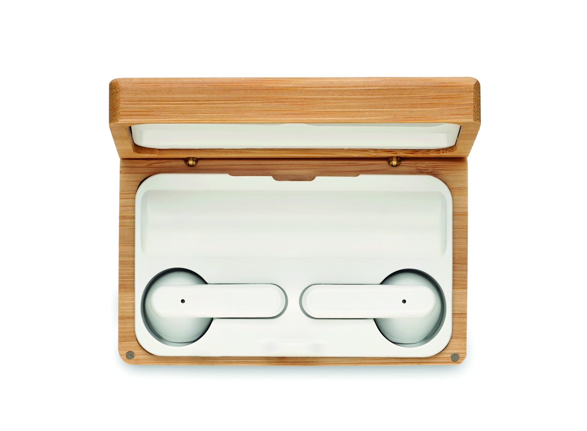 5.3 TWS True Wireless Stereo Ohrhörer-Set mit Mikrofon im Bambuscase. Inkl. 1200 mAh Powerbank mit Typ-C-Eingang und Typ-A/Typ-C-Ausgang. Automatische Kopplung.