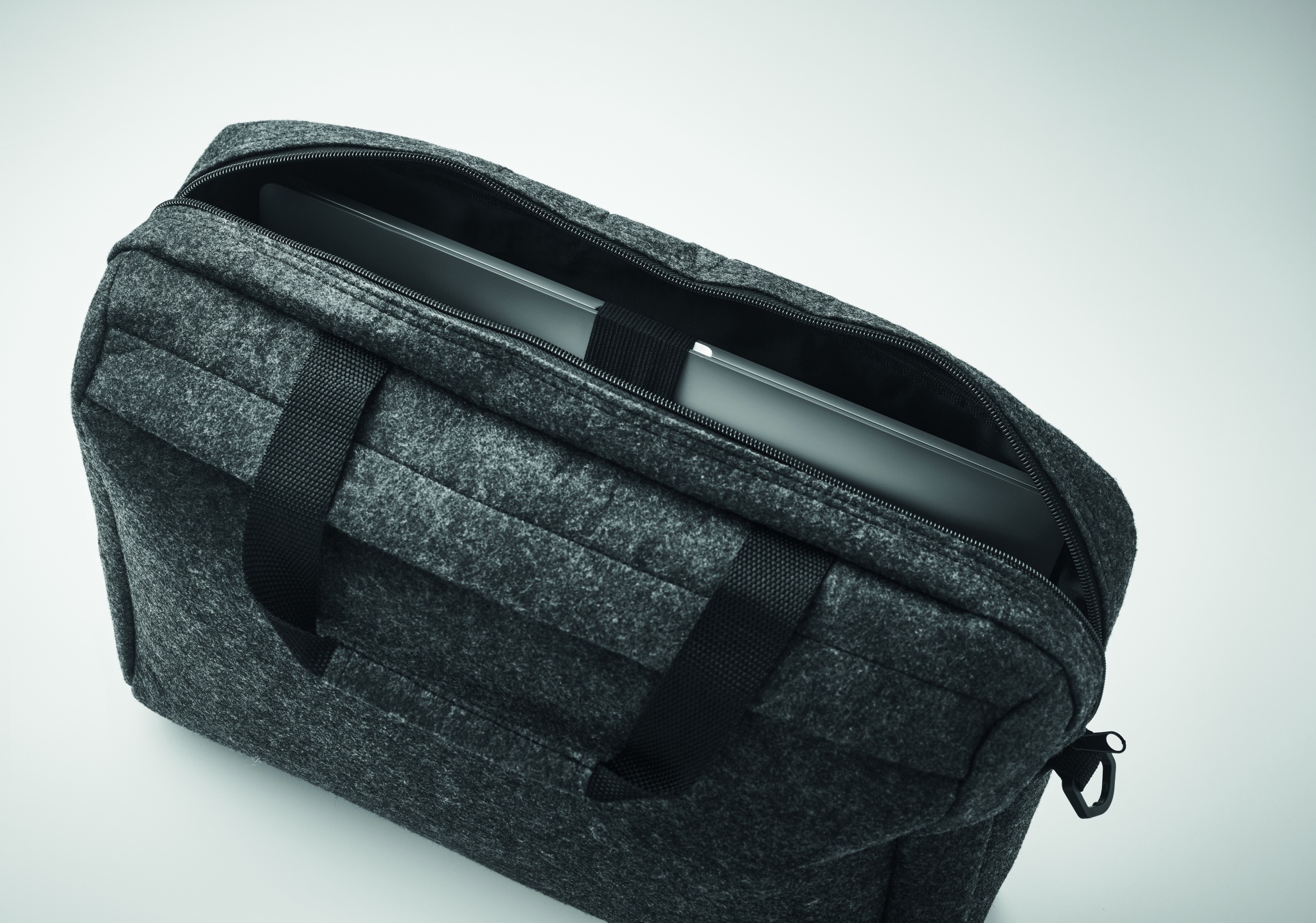 15 inch laptop bag in RPET felt including one main internal compartment and one zippered front pocket. Includes detachable and adjustable shoulder strap. Trolley holder on reverse side.