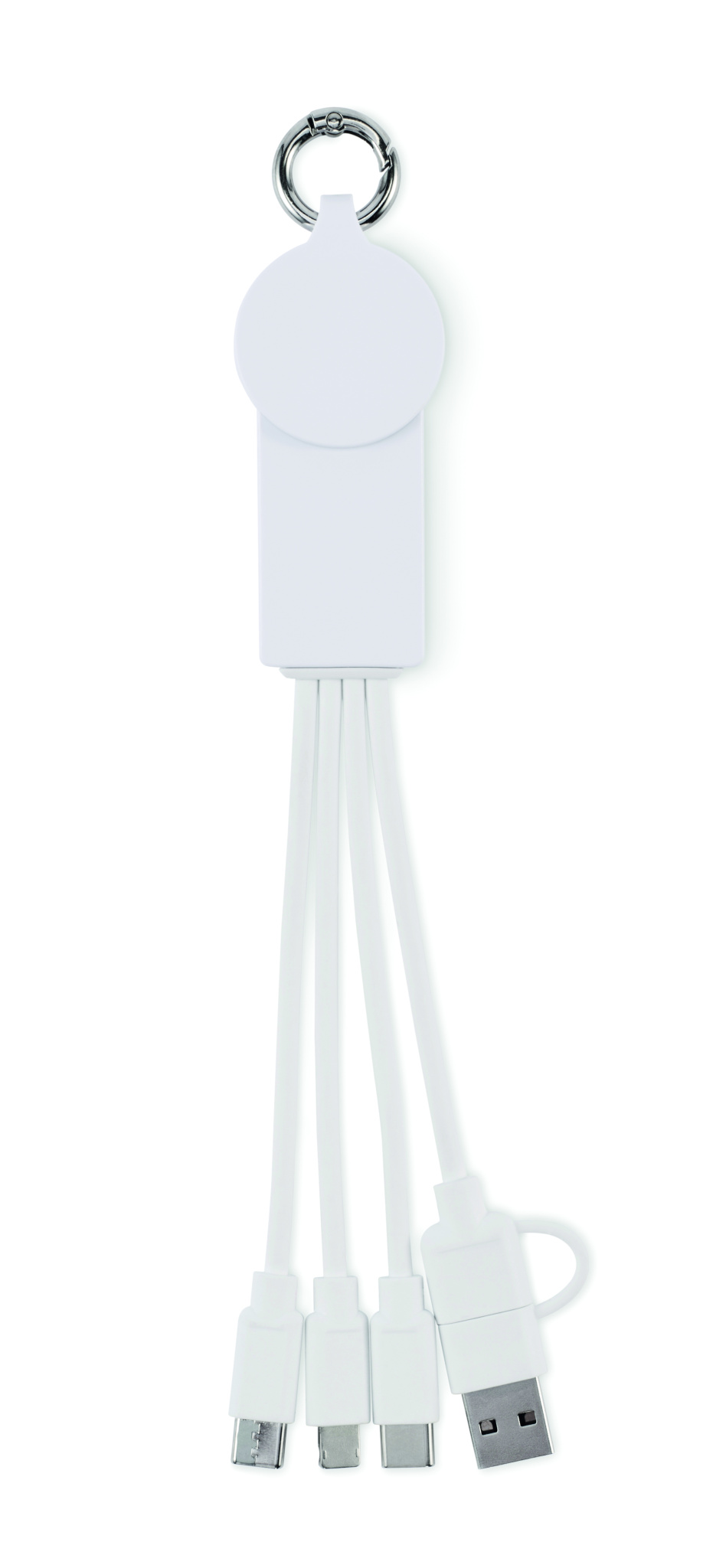 Key ring with charging cable with input: 2-in-1 type-C & type-A. Output: Watch charging (Samsung® and Apple®), 2 x type-C and micro-B (2 in 1 pin). Cable made of recycled TPE.