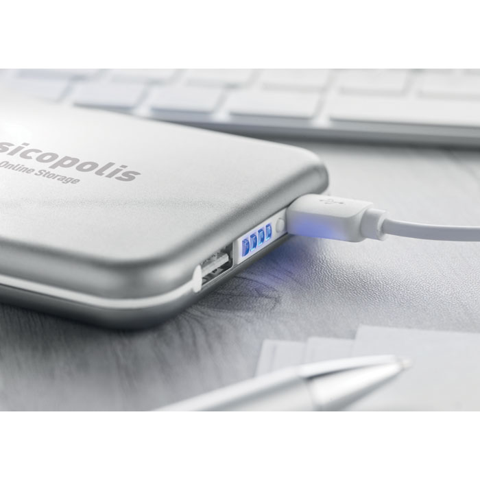Power bank 4000 mAh in aluminium and solar charging panel. Capacity for smartphone use, output current DC5V/1A. Includes indicating light and USB cable with micro usb plug.