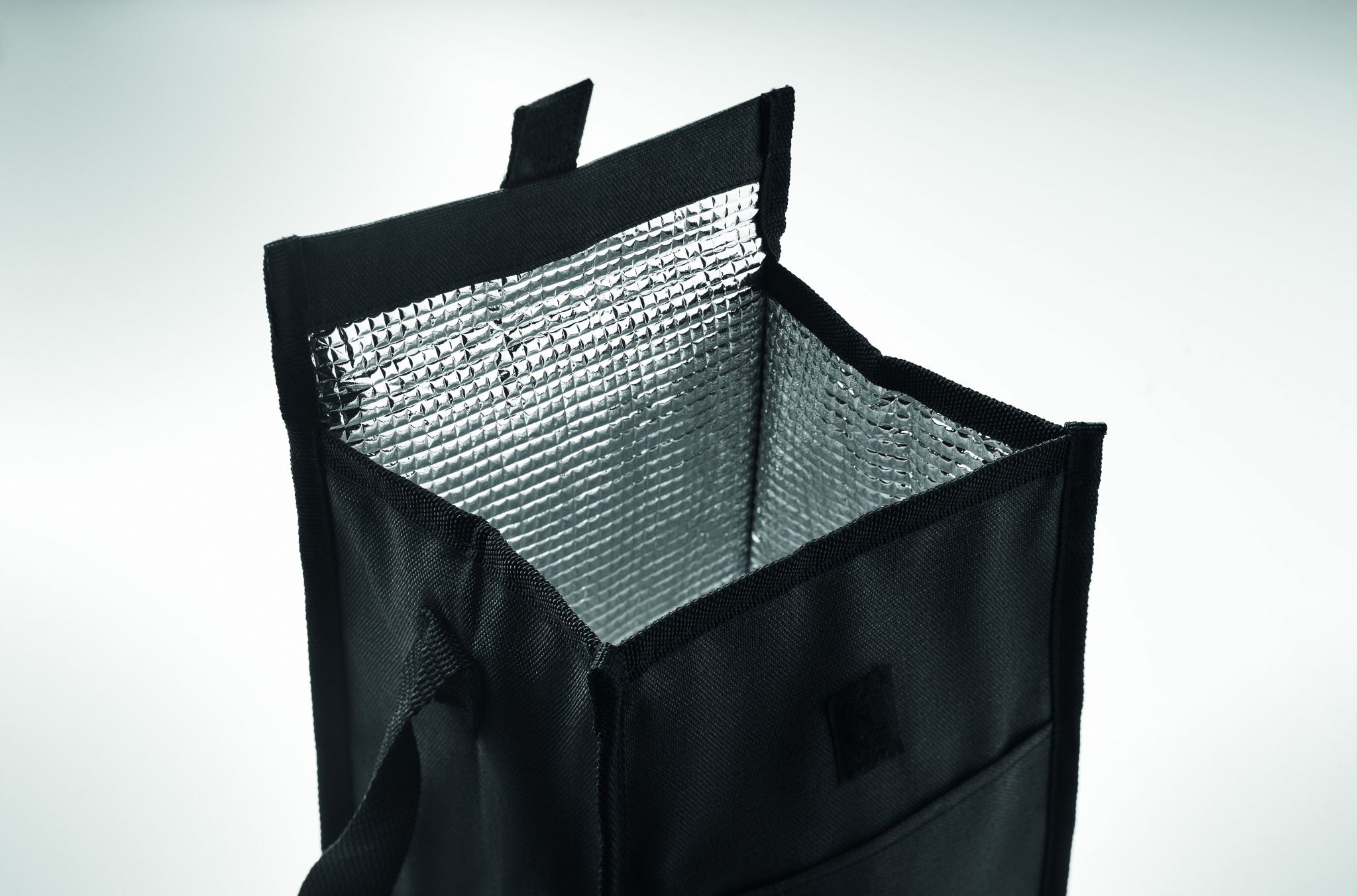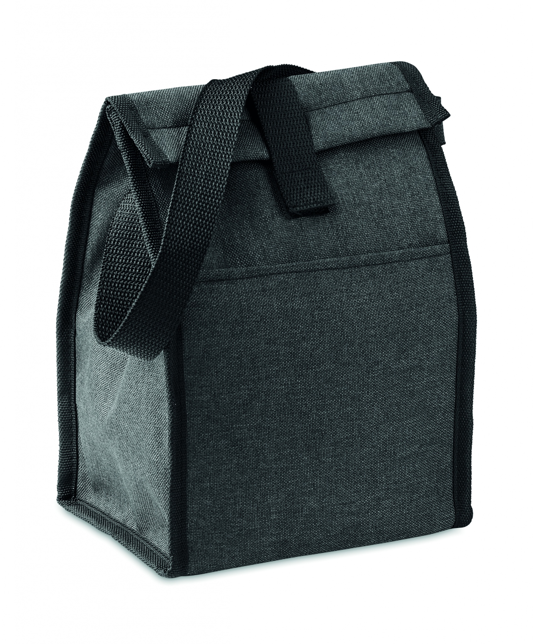 Insulated lunch bag in 600D RPET with front pocket. Capacity 3L. Insulation material: 2 mm PE foam with aluminium foil.