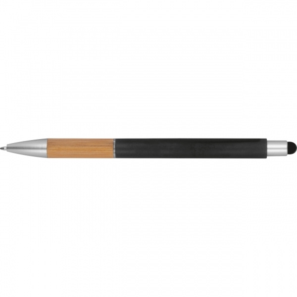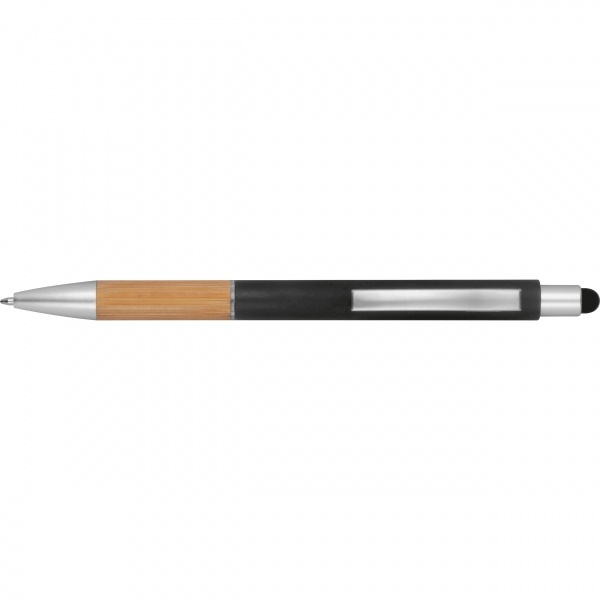 Retractable ballpoint pen with a bamboo grip zone, touch function and blue refill. We print your logo next to the clip.