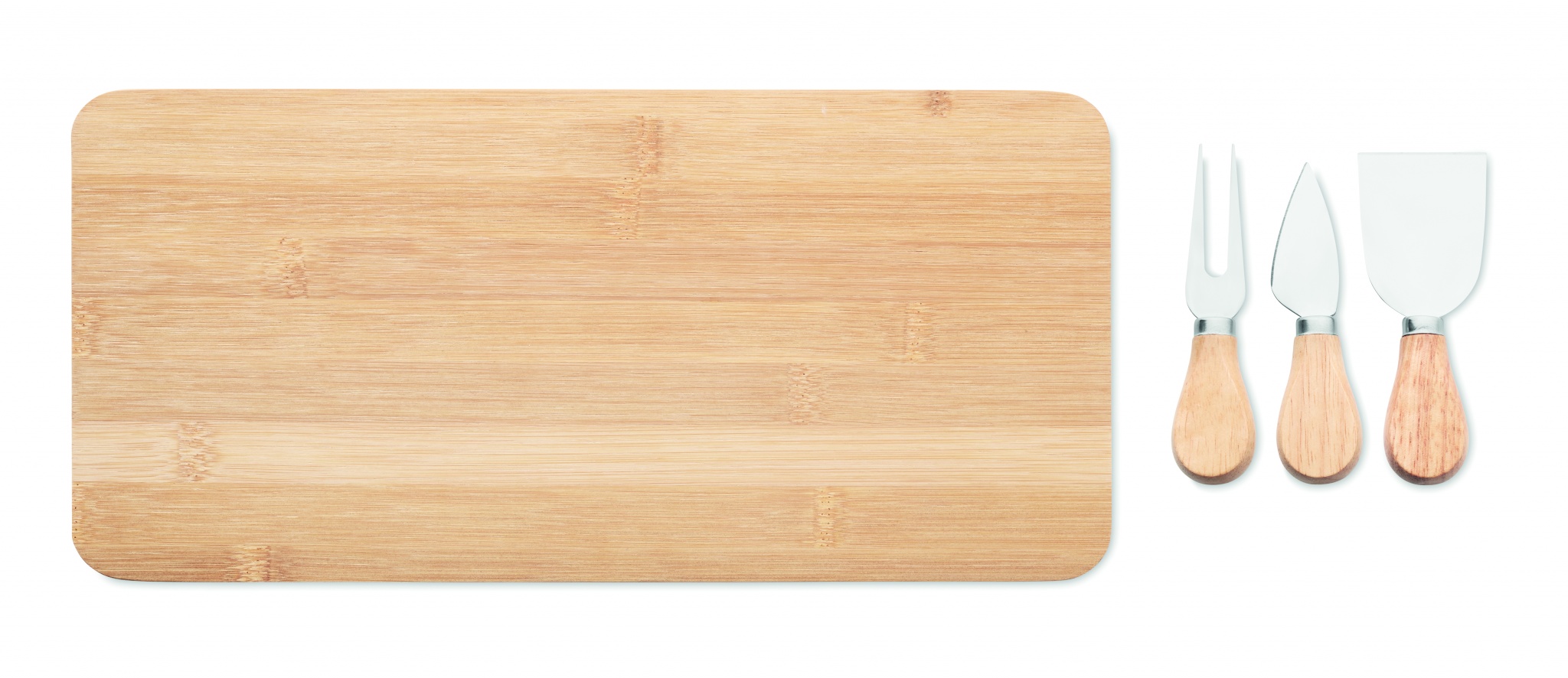 Bamboo Cheese set serving board with 2 serving knives and a fork. Bamboo is a natural product, there may be slight variations in colour and size per item, which can affect the final decoration outcome.