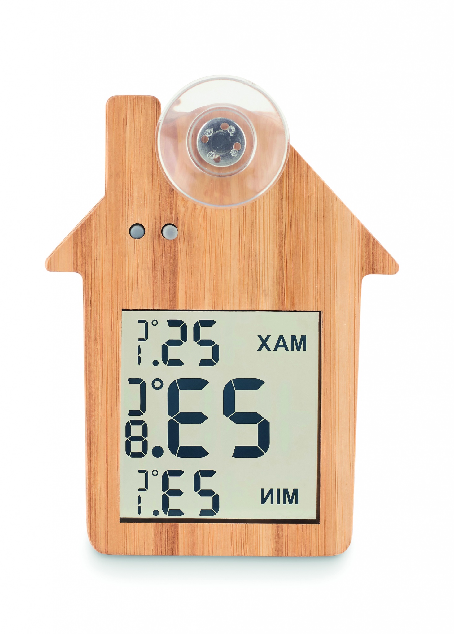 House-shaped bamboo weather station with suction cup on the back. 1 LR44 battery included. Bamboo is a natural product, there may be slight variations in colour and size per item, which can affect the final decoration outcome.