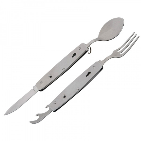 Two-piece camping cutlery made of stainless steel. It can be split in the middle so you get knife and fork, or bottle opener and spoon. We engrave your logo on one side.