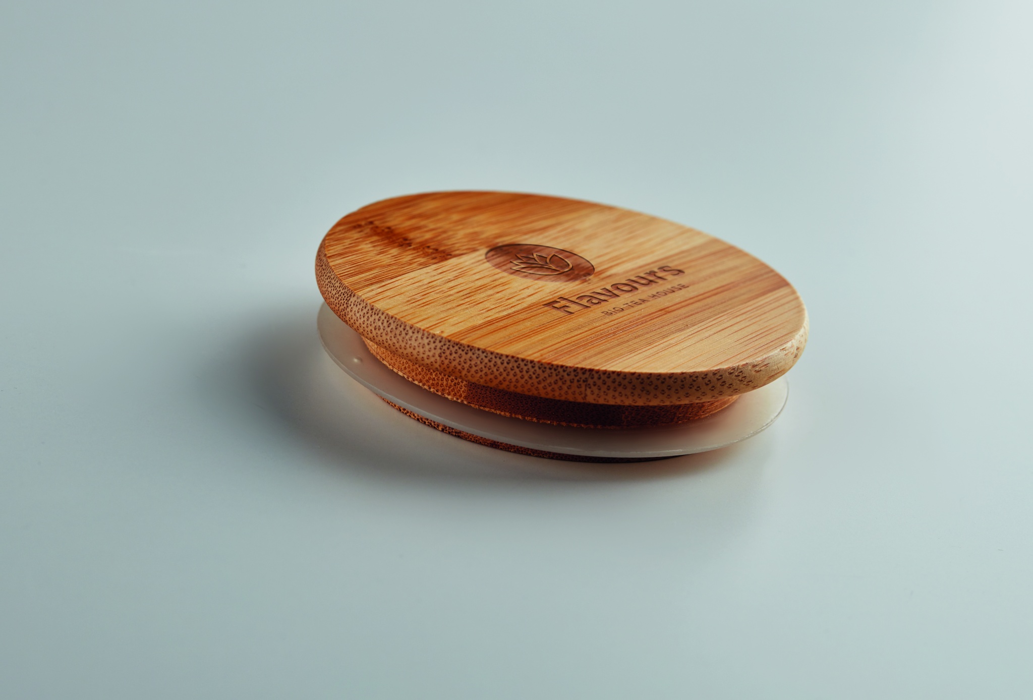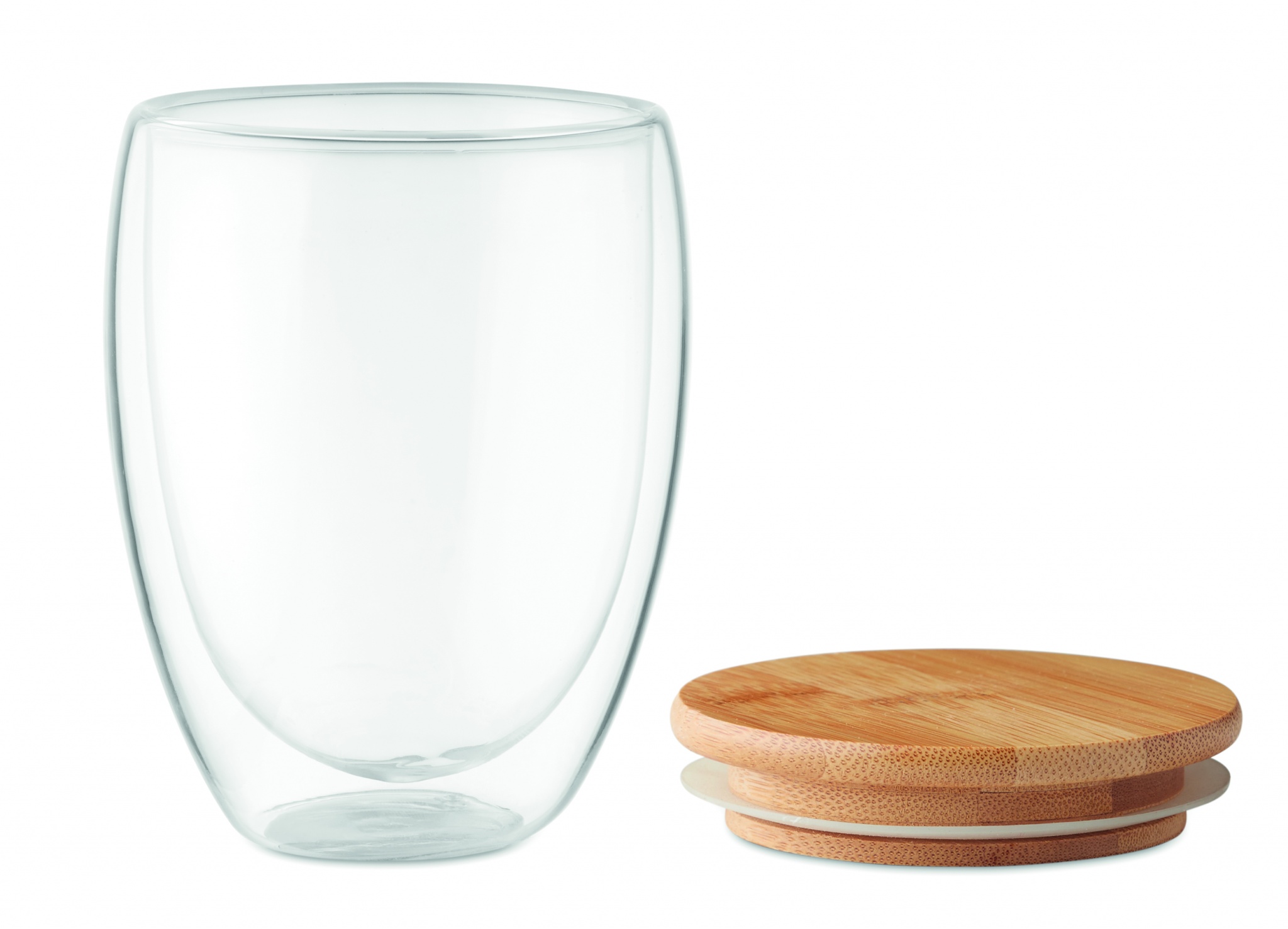 Double wall high borosilicate glass with bamboo lid with silicone ring. Capacity 350 ml. Bamboo is a natural product, there may be slight variations in colour and size per item, which can affect the final decoration outcome.