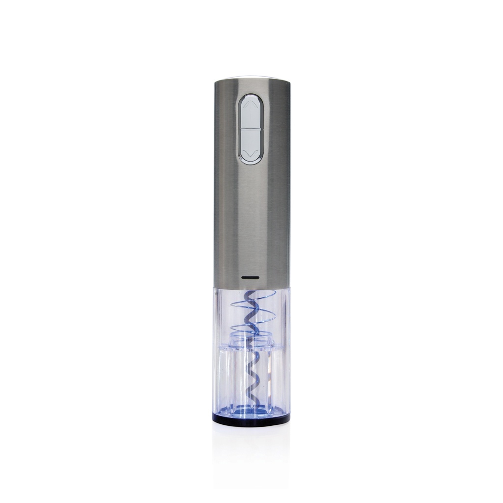 Modern electric corkscrew with innovative 3.6V lithium battery. With built-in blue light. Opens your wine bottle with ease in 8 seconds. Including micro USB cable to charge the device. Packed in a giftbox.