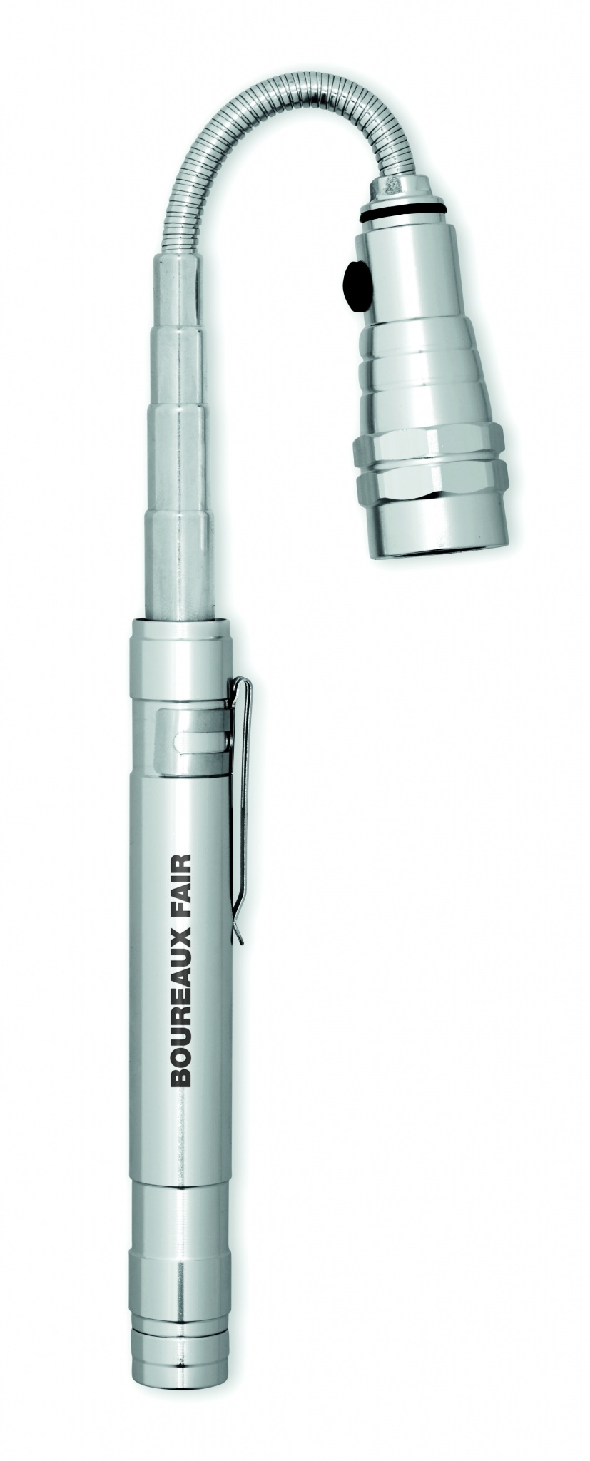 Extendable aluminium torch with 3 LED light and magnet on top and clip on side. 4 Batteries LR44 included. Maximum length 57 cm.