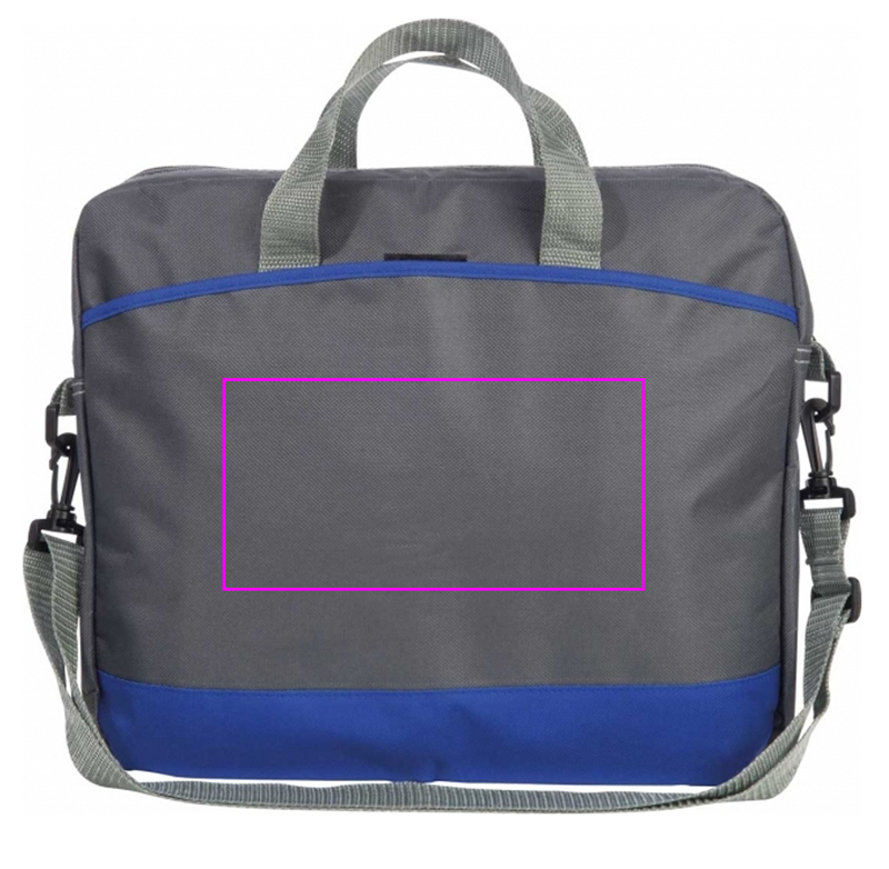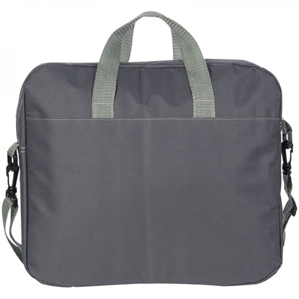 Gray laptop bag with bright colored accents, spacious interior compartment, and front compartment, on which we will print your logo.