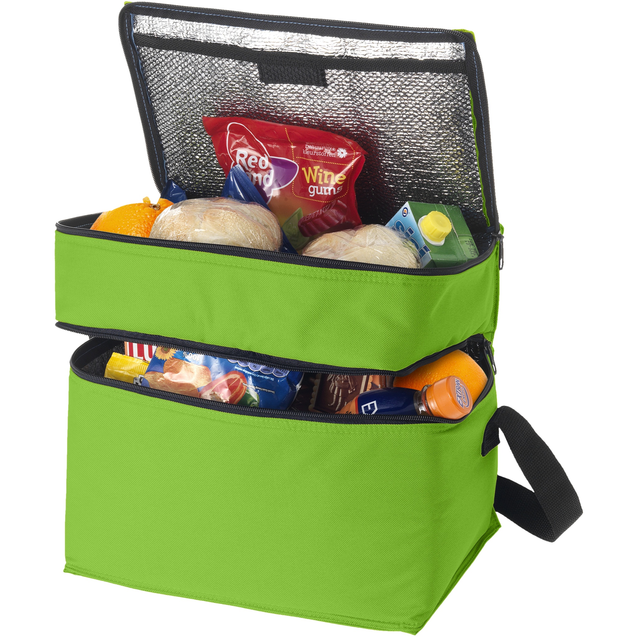 Be assured of cooled drinks and snacks anytime and anywhere with the Oslo cooler bag. The cooler bag has two separate zippered compartments. The upper part is perfect for storing small snacks, and the lower part is ideal for larger groceries. The shoulder strap is adjustable, so the bag is easy to carry by everyone. The cooler bag consists of 600D of polyester, a heavy-duty and durable fabric.