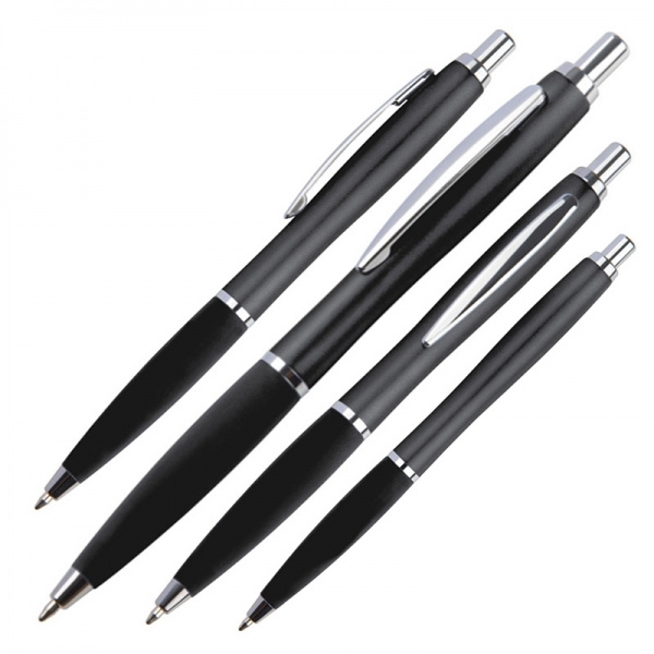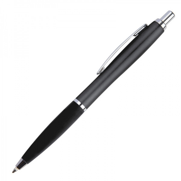 Slim plastic ballpen with blue-writing plastic refill and rubberized grip zone. Your logo will be printed below the clip.