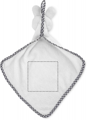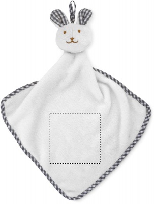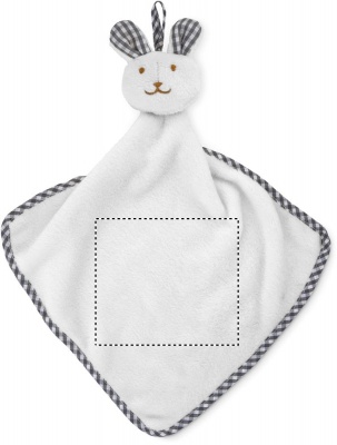 Plush baby towel in velvet polyester with rabbit design on the top. 180gr/m².