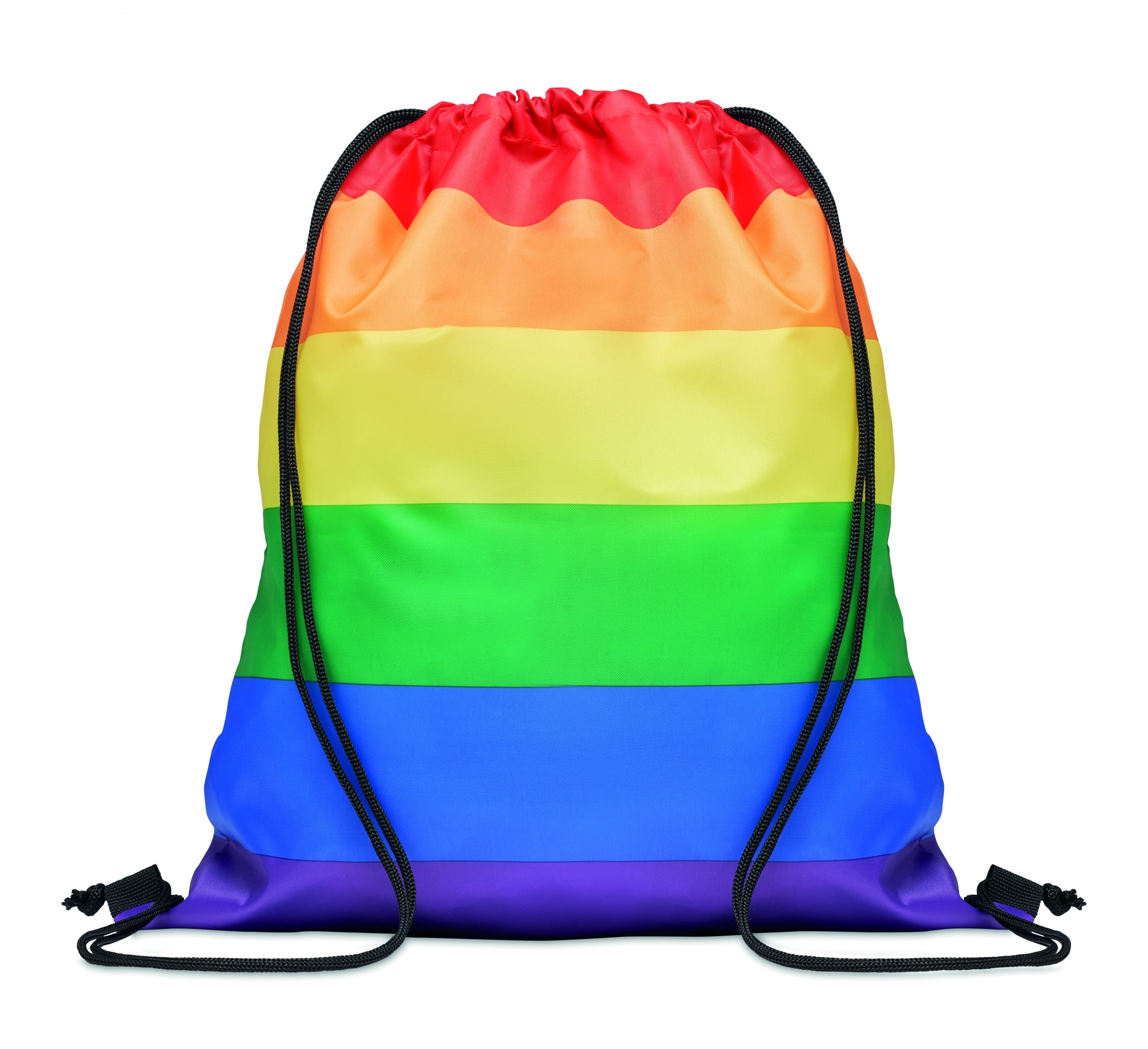 Rainbow Drawstring bag in 210D RPET polyester with PP strings.