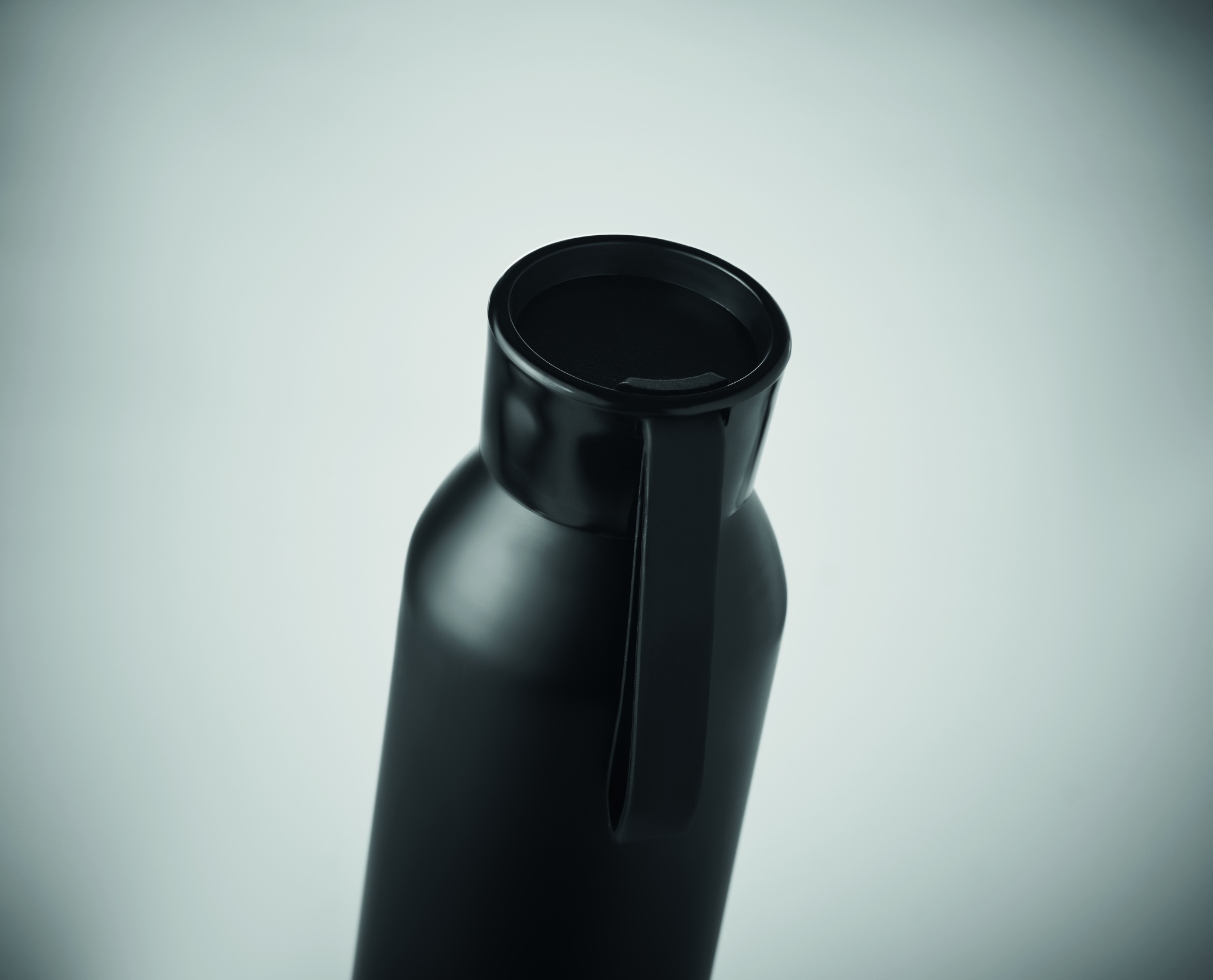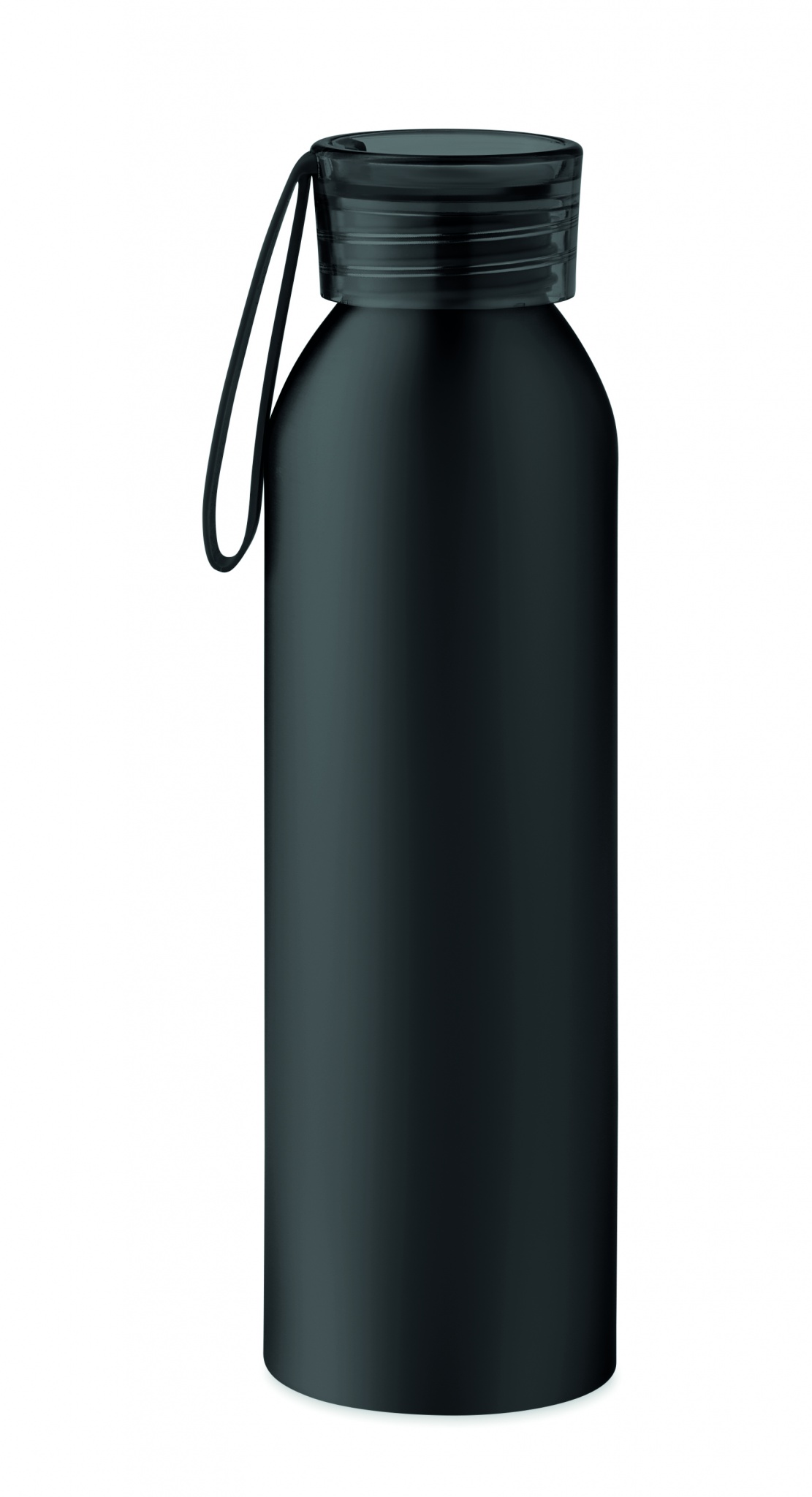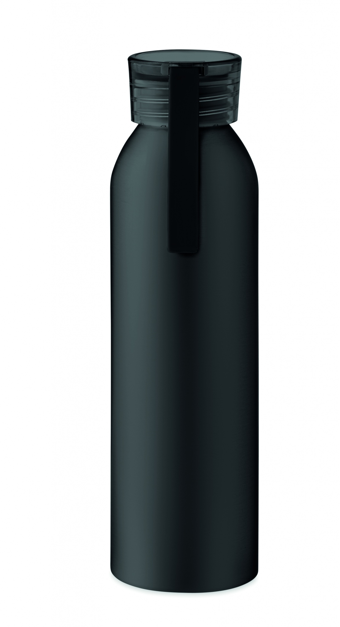 Single wall in recycled aluminium bottle with PS lid and silicone hanger. Capacity: 600 ml. Leak free.