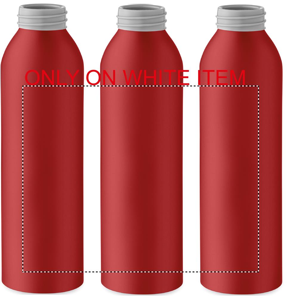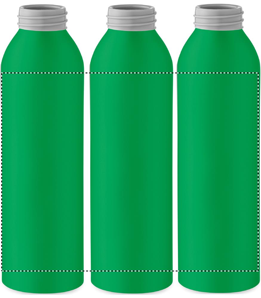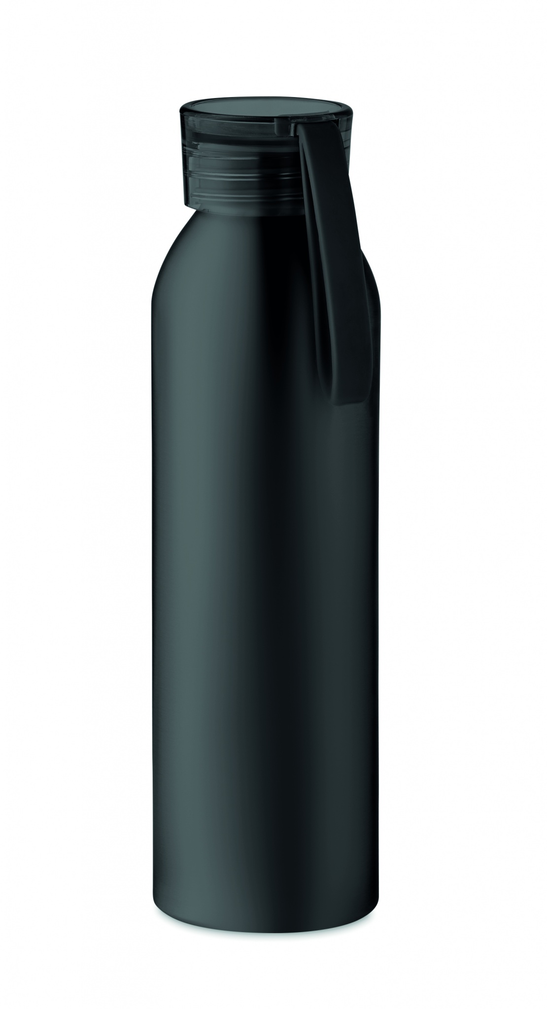 Single wall in recycled aluminium bottle with PS lid and silicone hanger. Capacity: 600 ml. Leak free.