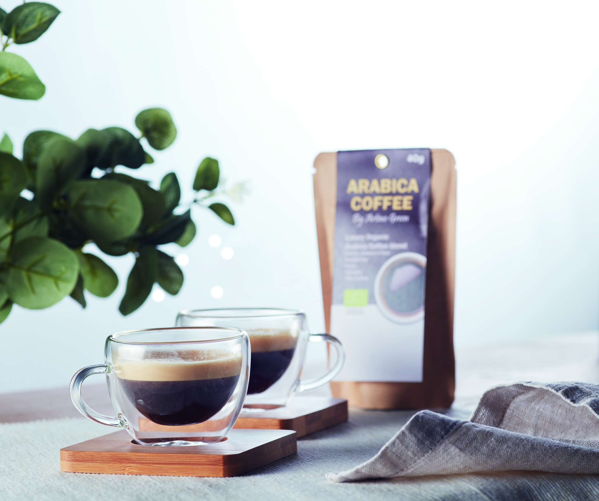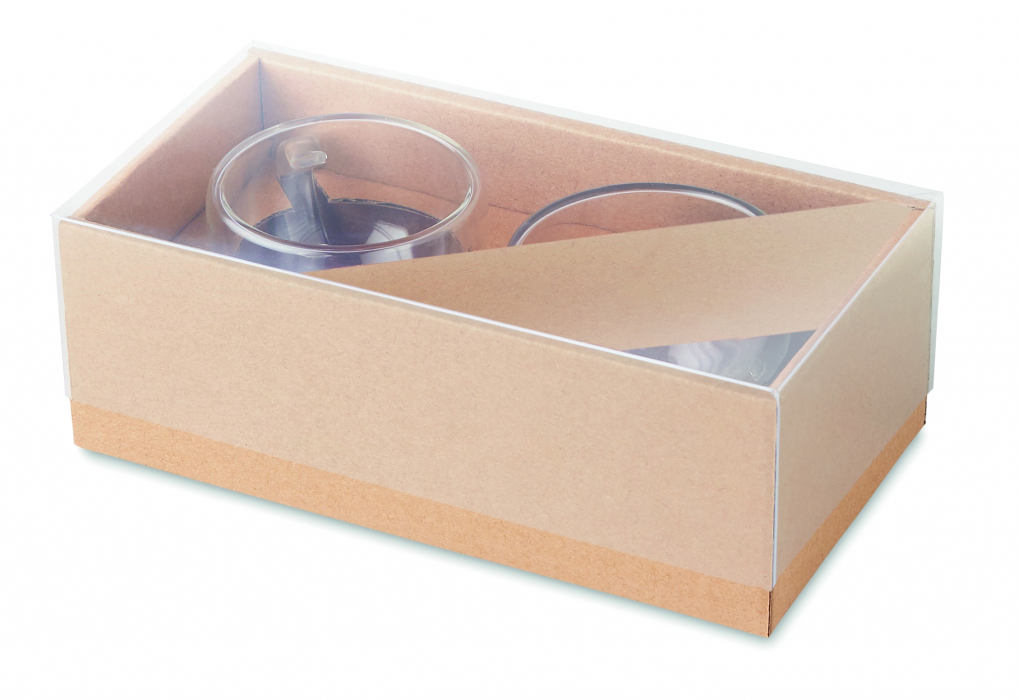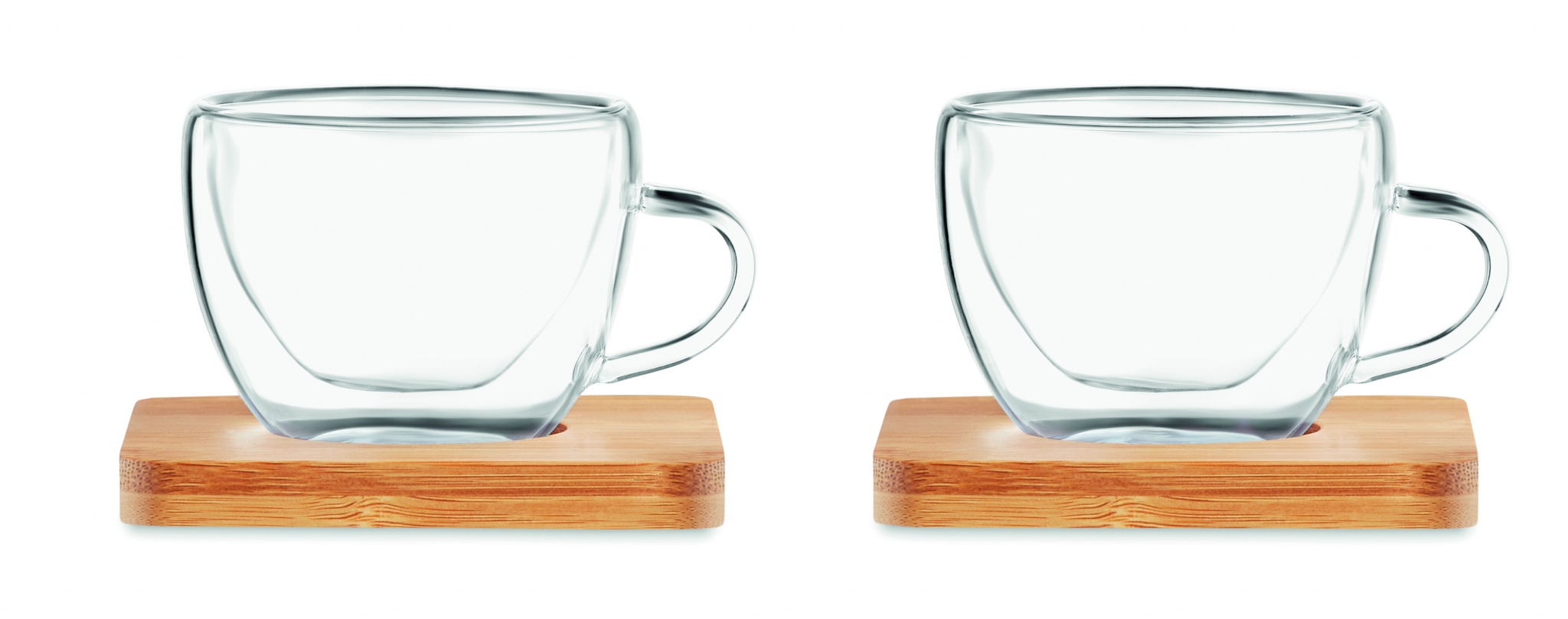 Set of 2 double wall espresso glasses with bamboo saucer. Presented in Kraft paper box. Capacity 60 ml. Bamboo is a natural product, there may be slight variations in colour and size per item, which can affect the final decoration outcome.
