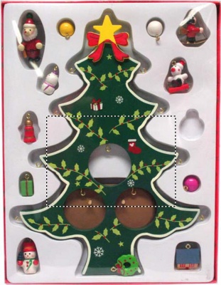 Wooden Christmas tree with 12 assorted tree hanger decorations to be assembled. Individual gift box with transparent cover.