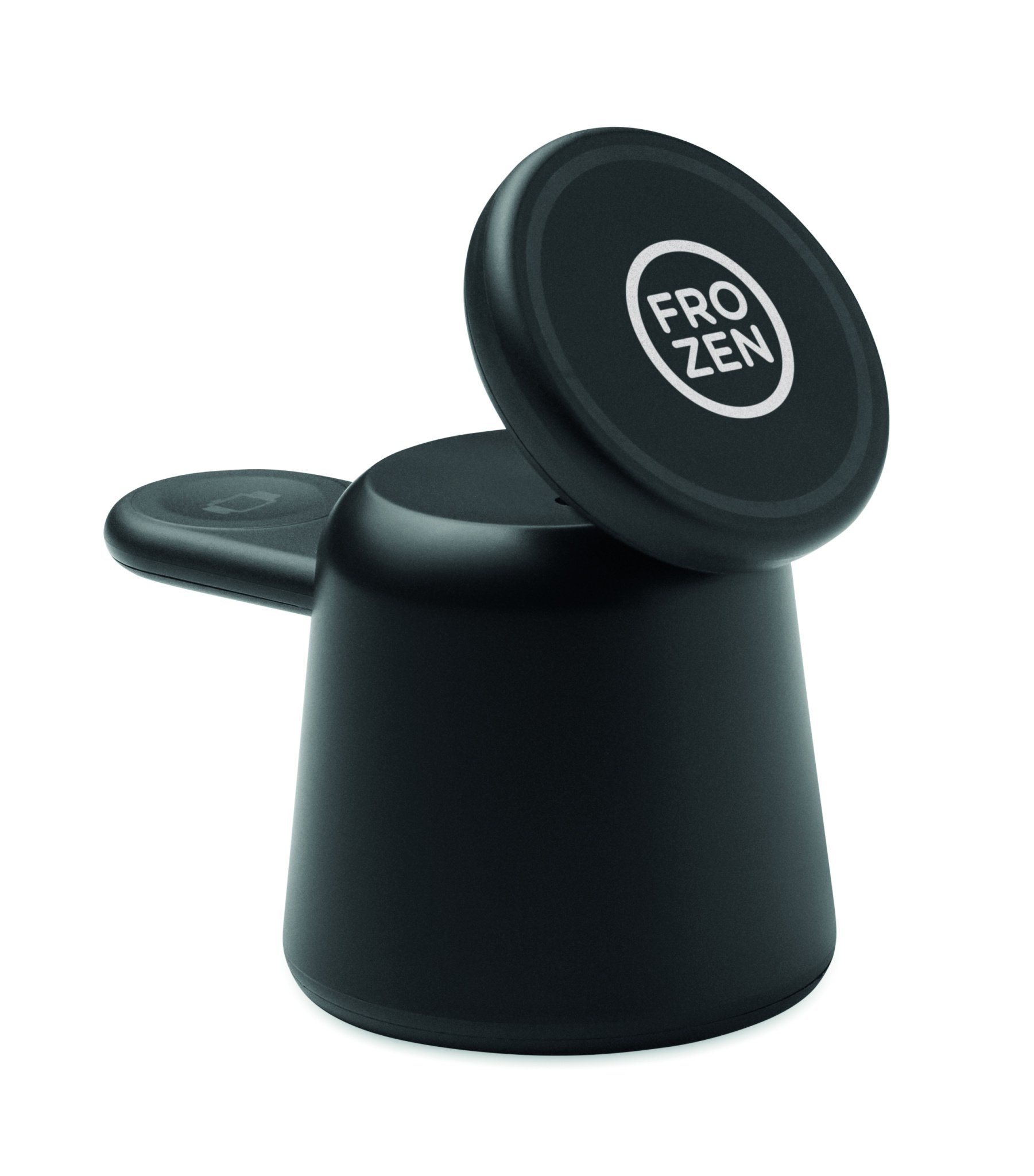 3-ühes ABS-plastist laadimisjaam. Komplektis 15 W magnetiline juhtmevaba laadija telefonile ja TWS-ile koos telefonihoidiku funktsiooniga ning nutikella laadija (ainult iOS-ile). Magnetiline funktsioon ühildub iPhone® 12 ja uuemate mudelitega. Komplektis täiendav magnetiline metallrõngas teiste mittemagnetiliste juhtmevabalt laetavate telefonide laadimise toetamiseks.
