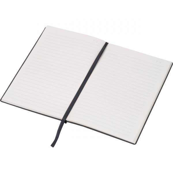 A5 märkmik painduva pehme PU-kaanega, järjehoidja ja 192 taaskasutatud paberist lehtedega. Teie logo trükitakse kaanele punutud ala alla.
