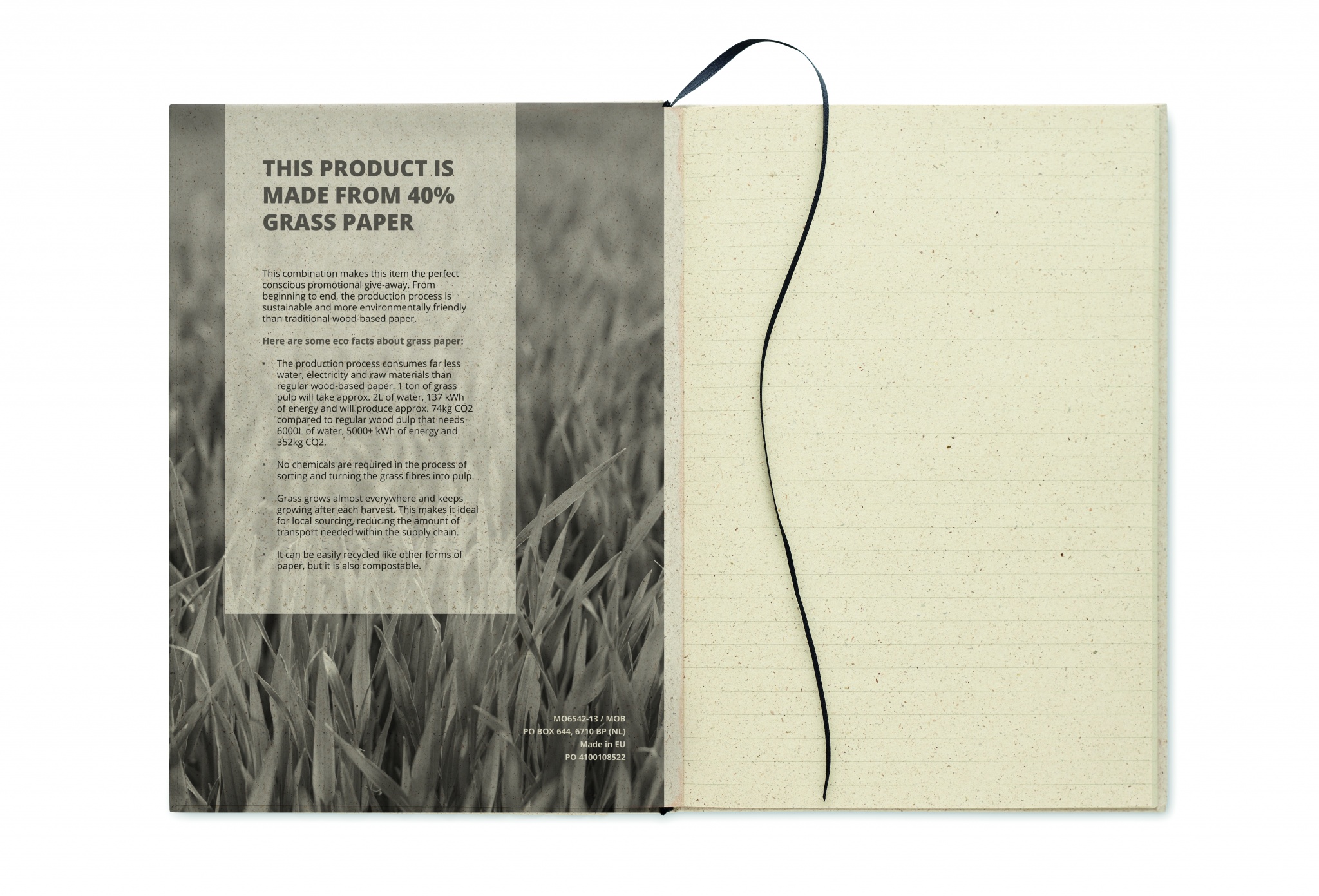 A5 murupaberist märkmik. Kõva murupaberist kate. Casebound. 160 murupaberiga vooderdatud lehte (80 lehte). 95 gsm paber. Elastne sulgemisrihm ja lindiga järjehoidja. 40% murukiude sisaldav murupaber.