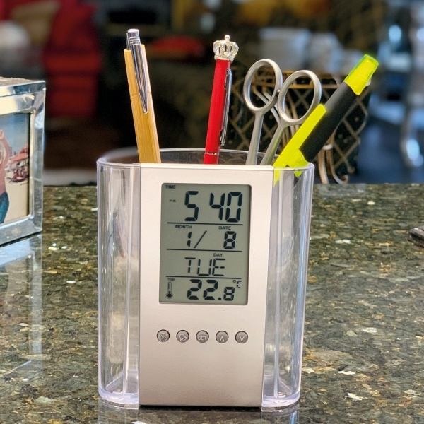 Akrüülist lauapliiatsihoidja hõbetatud esiosaga; sellel on kell, äratus, kuupäev, nädalapäev ja toatemperatuur (C / F) ning nööpelemendiga patarei. Trükime teie logo multifunktsionaalse ekraani alla.
