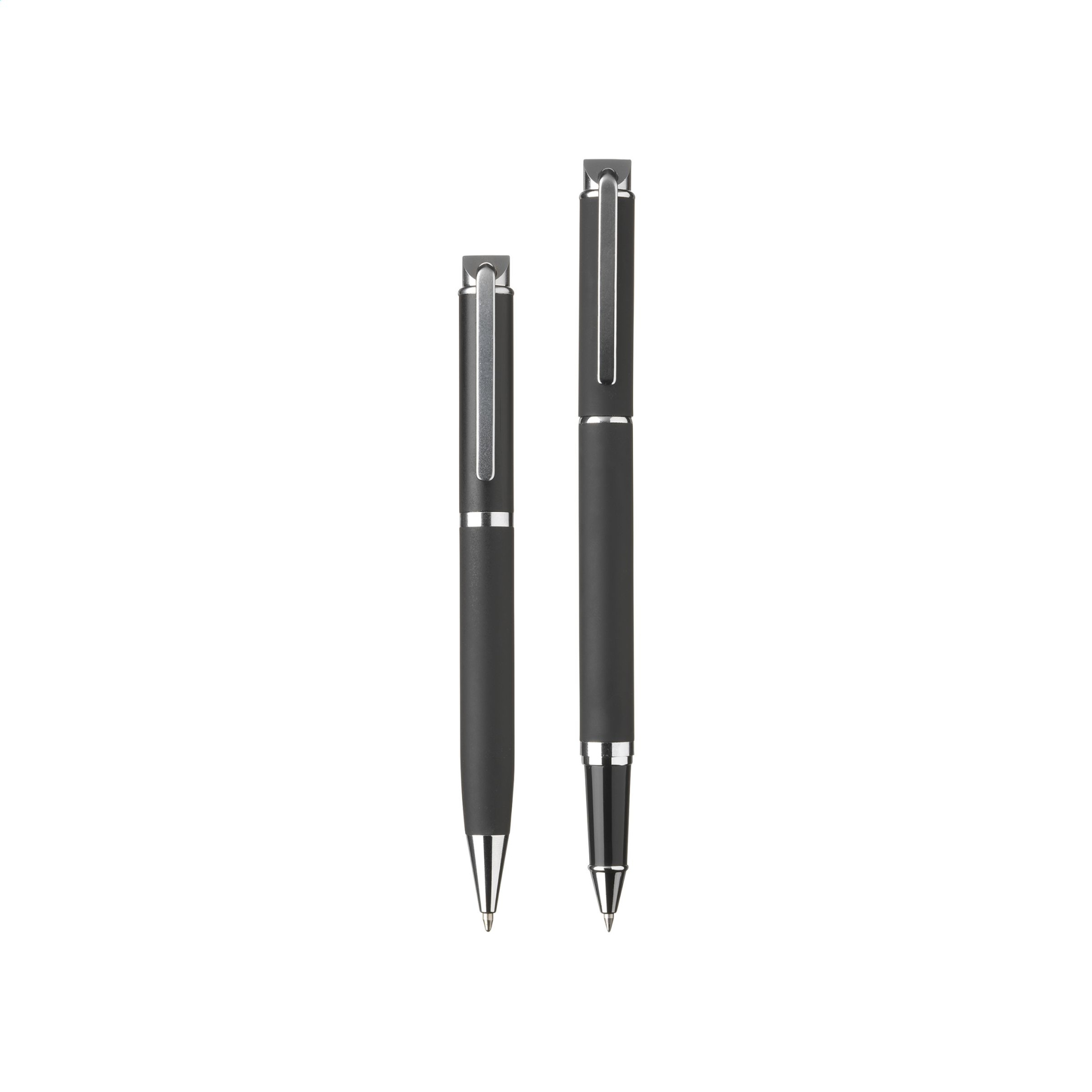 Metallist kirjutuskomplekt: sinine tindipliiats ja rullpliiats. Mõlemad stiilse kummeeritud viimistlusega, kauni disainiga klambriga topp ja läikivad aktsendid. Esemed tarnitakse komplektina, iga komplekt eraldi karbis.