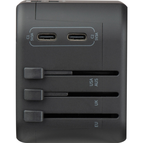 Plastikust reisiadapter 2 USB ja 2 USB-C pesaga. Adapter sisaldab pistikuid EL, Ühendkuningriigi ja USA jaoks. Korpus võimaldab praktilist hoiustamist igas kotis. Kompaktne ja mitmekülgne elektroonikaseadmete ülemaailmseks kasutamiseks.