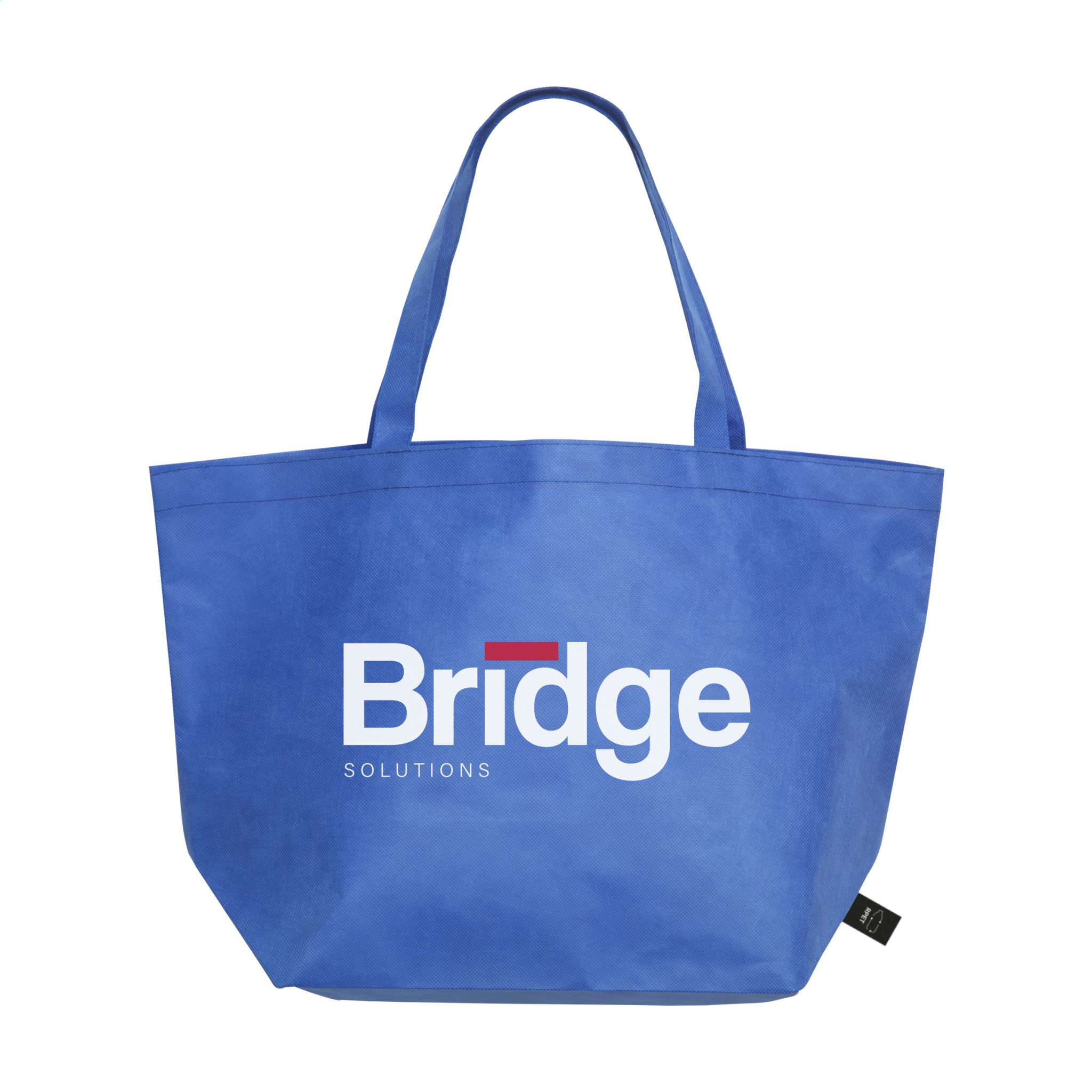 Mahukas RPET lausriidest ostu- ja rannakott (80 g/m²), mis on valmistatud taaskasutatud PET-pudelitest. Lai kott, nii tugev kui ka kerge pikkade sangadega. Mahutavus ca. 25 liitrit.