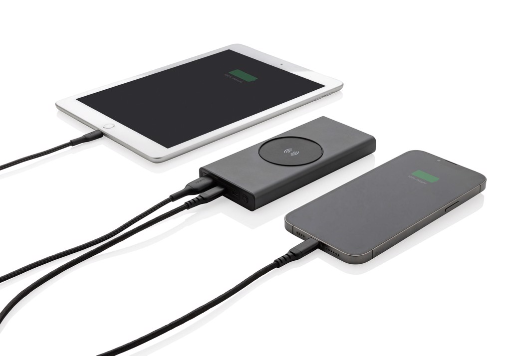 Ülikiire laadimise aku, mis on valmistatud RCS-i (Recycled Claim Standard) sertifitseeritud taaskasutatud alumiiniumist ja ABS-ist. Taaskasutatud kogusisaldus: 28% kauba kogukaalust. RCS-sertifikaat tagab taaskasutatud materjalide täielikult sertifitseeritud tarneahela. Alumiinium ei kaota ringlussevõtu käigus oma omadusi ja seda saab ringlusse võtta lõputult. Akupank sisaldab kauakestvat A-klassi 10 000 mAh liitiumpolümeerakut. C-väljundport toetab kiiret laadimist kuni 18 W ja ka kiiret uuesti laadimist 3 tunni jooksul. Juhtmeta laadija toetab juhtmevaba laadimist kuni 10 W. Toiteindikaatorid näitavad järelejäänud energiataset, nii et teate alati, millal laadida. Toode ja tarvikud 100% PVC-vaba. Sisaldab C-tüüpi laadimiskaablit, mis on valmistatud RCS-sertifikaadiga taaskasutatud alumiiniumist, TPE-st ja PET-st. Pakitud FSC® segupakendisse. USB väljund 5/3A, 9V/2A. 12V/1,5A. C-tüüpi väljund: 5V/3A, 9V/2A, 12V/1,5A. C-tüüpi sisend: 5V/3A, 9V/2A, 12V/1,5A. Mikro-USB sisend: 5V/2A, 9V/2A, 12V/1,5A.