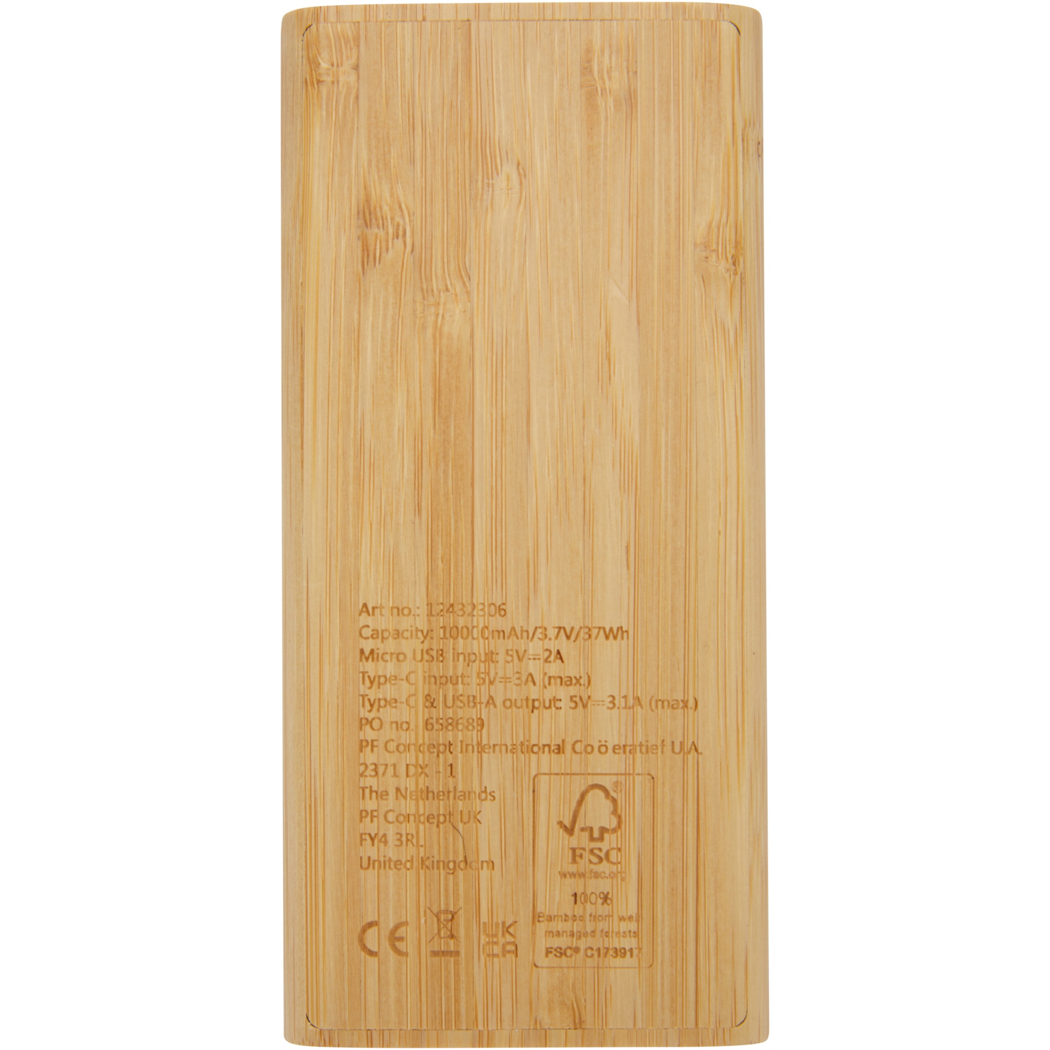 10 000 mAh bambusest akupank, millel on SISSE/VÄLJA puutetundlik nupp ja 4 LED-indikaatorit, mis näitavad järelejäänud aku mahtuvust. Mikro-USB-sisend 5V/2A, C-tüüpi sisend 5V/3A, C-tüüpi väljund max 5V/3,1A, kaks USB-A-väljundit 5V/3,1A max, koguvõimsus 15,5W. Tarnitakse 30 cm TPE 3A Type-C kuni Type-C laadimiskaabli, kasutusjuhendi ja jõupaberist kinkekarbiga. Kuna bambus on naturaalne toode, võib ühe eseme värvis ja suuruses esineda mõningaid erinevusi, mis võivad mõjutada lõpptulemust.