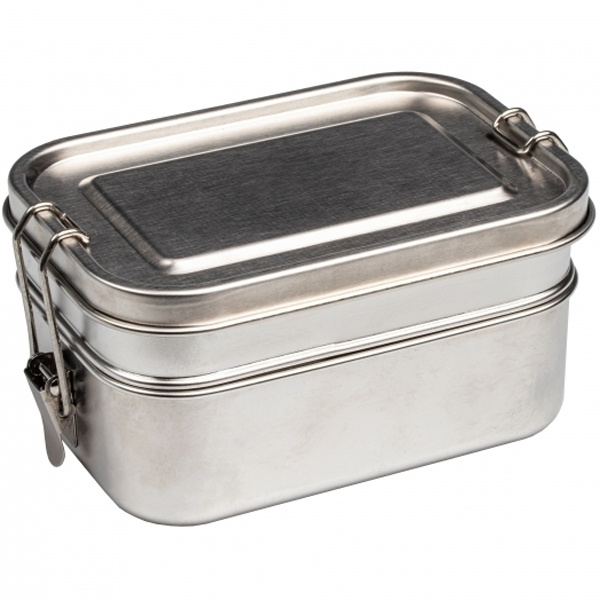 Ruostumattomasta teräksestä valmistettu kaksikerroksinen, kestävä, ympäristöystävällinen ja vankka lounasrasia (alhainen 700 ml, ylhäällä 450 ml) kannella, joka voidaan sulkea puristimella molemmilta puolilta. Logosi kaiverretaan kanteen.