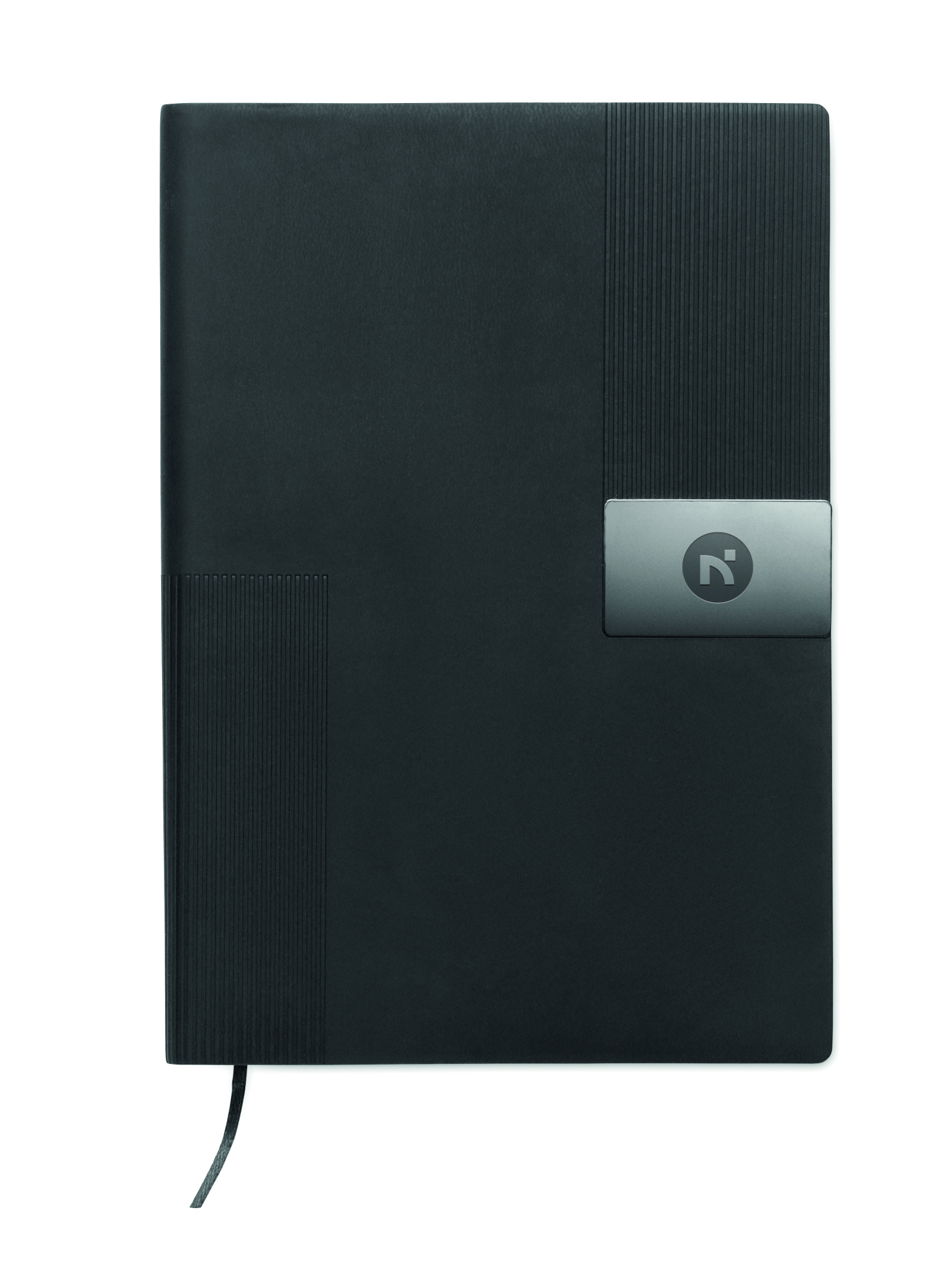 A5-kokoinen PU-muistikirja pehmeäkantisilla kansilla. Nidottu. 160 viivoitettua sivua (80 arkkia) kierrätyspaperista. Yhteensopiva kuminauha ja kirjanmerkkinauha. Metallinen rautakoristelu etupuolella.