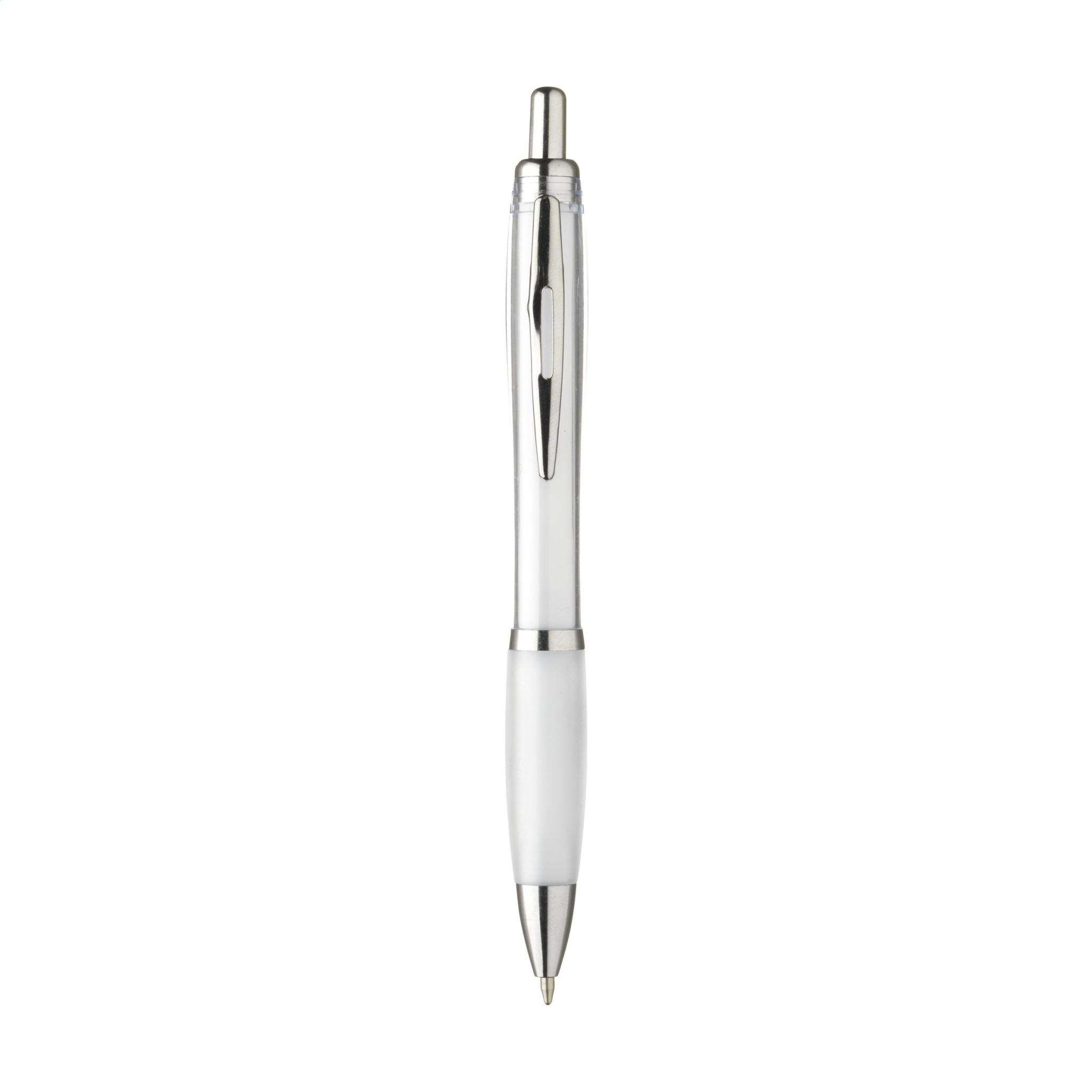 Sinisellä tai mustalla musteella kuulakärkikynällä on läpinäkyvä värillinen piippu, liukumaton kahva ja metallipidike.