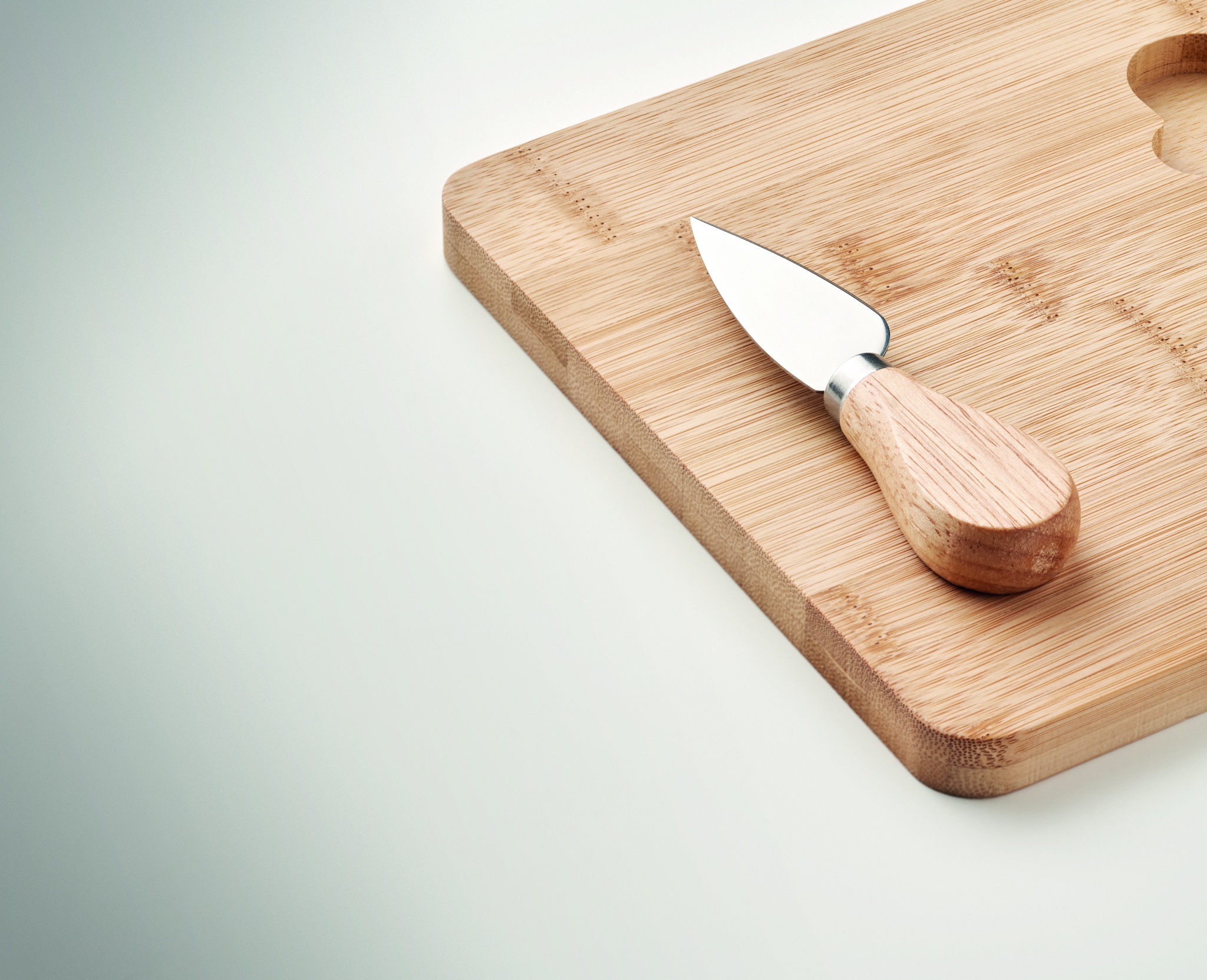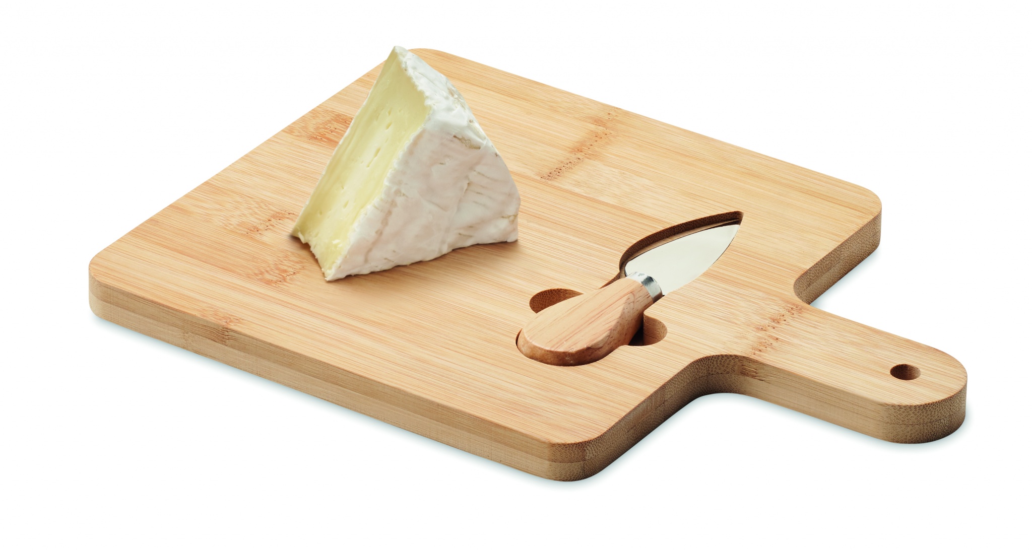 Bambusta valmistettu juustolauta tarjoiluveitsellä. Luonnollisen materiaalin (bambu) vuoksi, tuotteiden värissä/ koossa saattaa olla erinäisyyksiä ja tämä voi vaikuttaa painatuksen lopputulokseen.