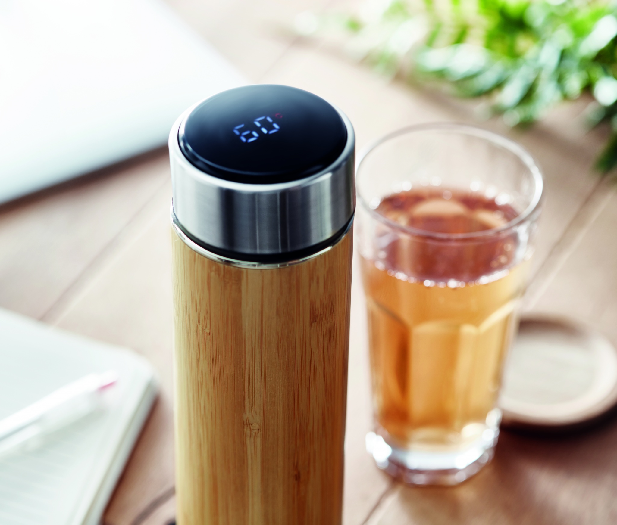 Kaksiseinäinen ruostumattomasta teräksestä valmistettu 480 ml termospullo, bambu kuorella. Sisältää LED kosketusnäytön pullon korkissa ja CR2032 patterin. Tuote on vuoto vapaa.
