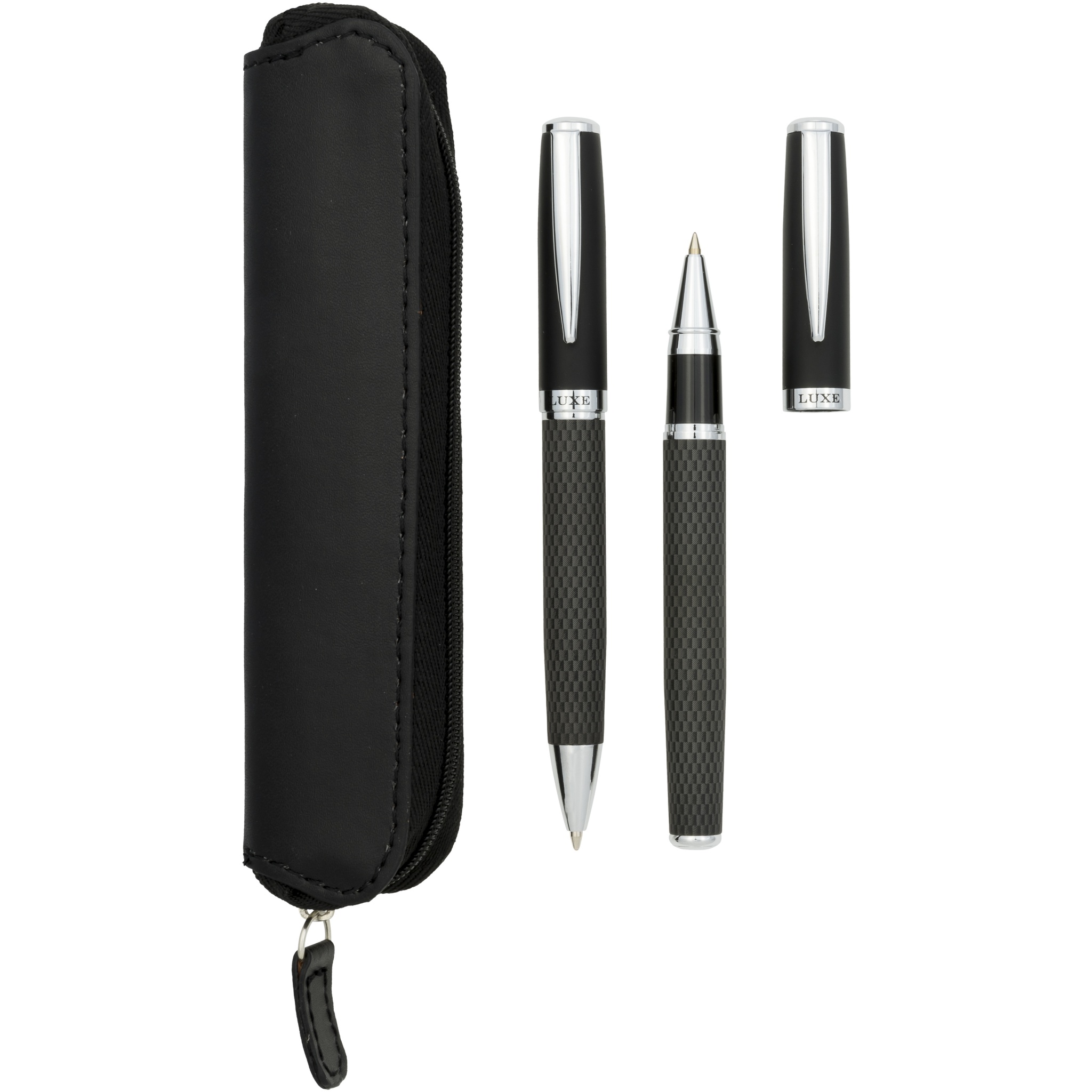 Hienovaraisesti erilainen, musta ja ylellisesti suunniteltu pari, johon kuuluu kuulakärki- ja mustekynä, jotka on viimeistelty painetulla hiilikuidulla. Sisältää laatua suojaavan pussin, pakattu ''LUXE''-lahjapakkaukseen.