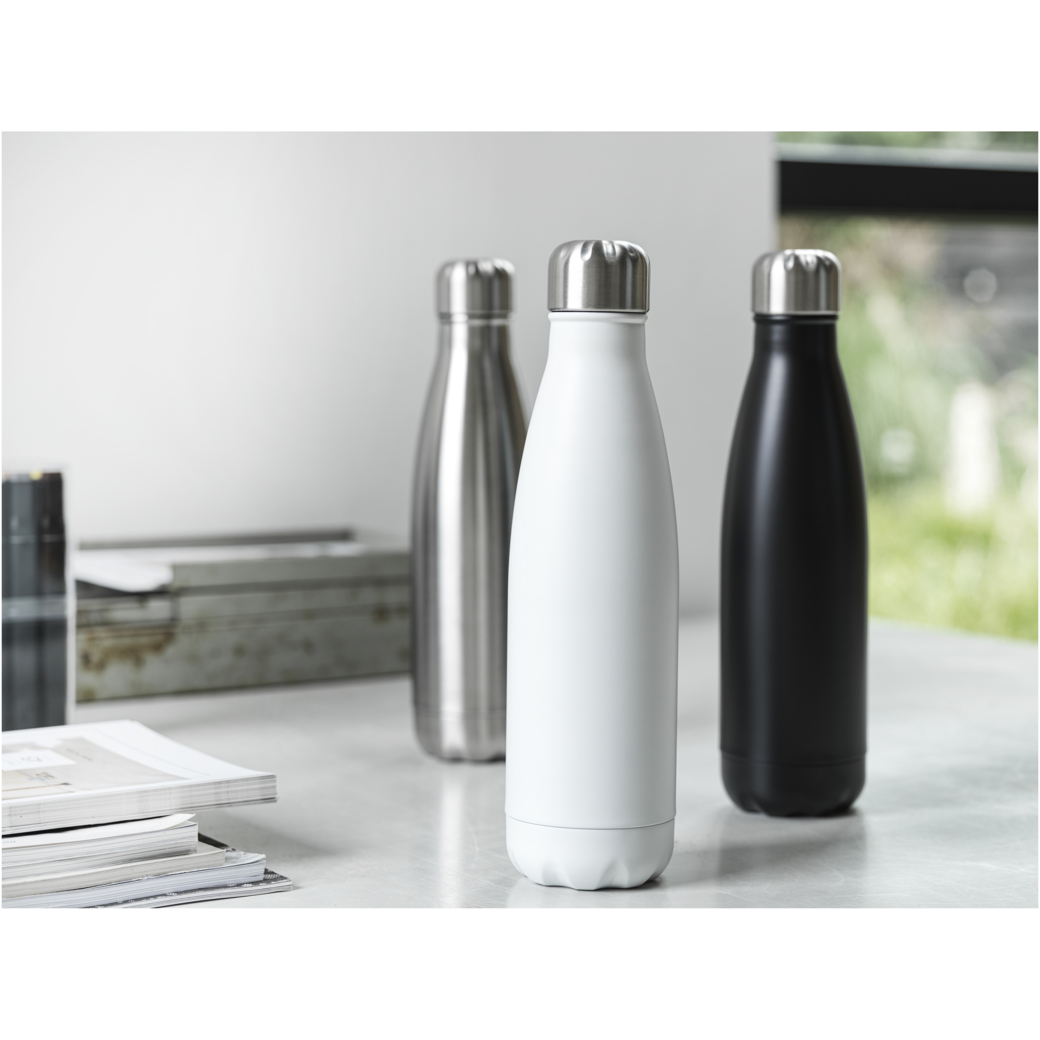 Tyhjiöeristetty RCS-sertifioitu kierrätetystä ruostumattomasta teräksestä valmistettu pullo ikonisella muotoilulla, joka pitää juomat kuumana tai kylmänä useita tunteja. Tämä tyylikäs vesipullo, jonka pohja sopii useimpiin mukinpidikkeisiin, on täydellinen mainostuote. Testattu ja hyväksytty Saksan elintarviketurvallisuslainsäädännön (LFGB) mukaisesti, ja ftalaattipitoisuus on testattu REACH-asetusten mukaisesti. Tilavuus on 500 ml. Toimitetaan kierrätetystä kartongista valmistetussa lahjapakkauksessa.
