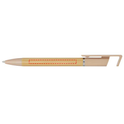 Bambukuulakärkikynä, jota voi käyttää myös puhelimen pidikkeenä. Painike ja keskiosan rengas on valmistettu kierrätetystä muovista, kärki messingistä ja runko vastuullisesti tuotetusta bambusta. Musteen väri: Sininen. Kirjoituspituus: 1000 metriä. Lyijyn paksuus: 1,0 mm.