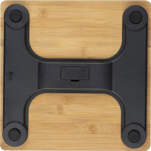 Digitaalinen bambuinen henkilövaaka, jonka enimmäiskuormapaino on 150 kg. Ilmoitukset voidaan näyttää kg/lb/st. Logosi kaiverretaan vaa'alle.