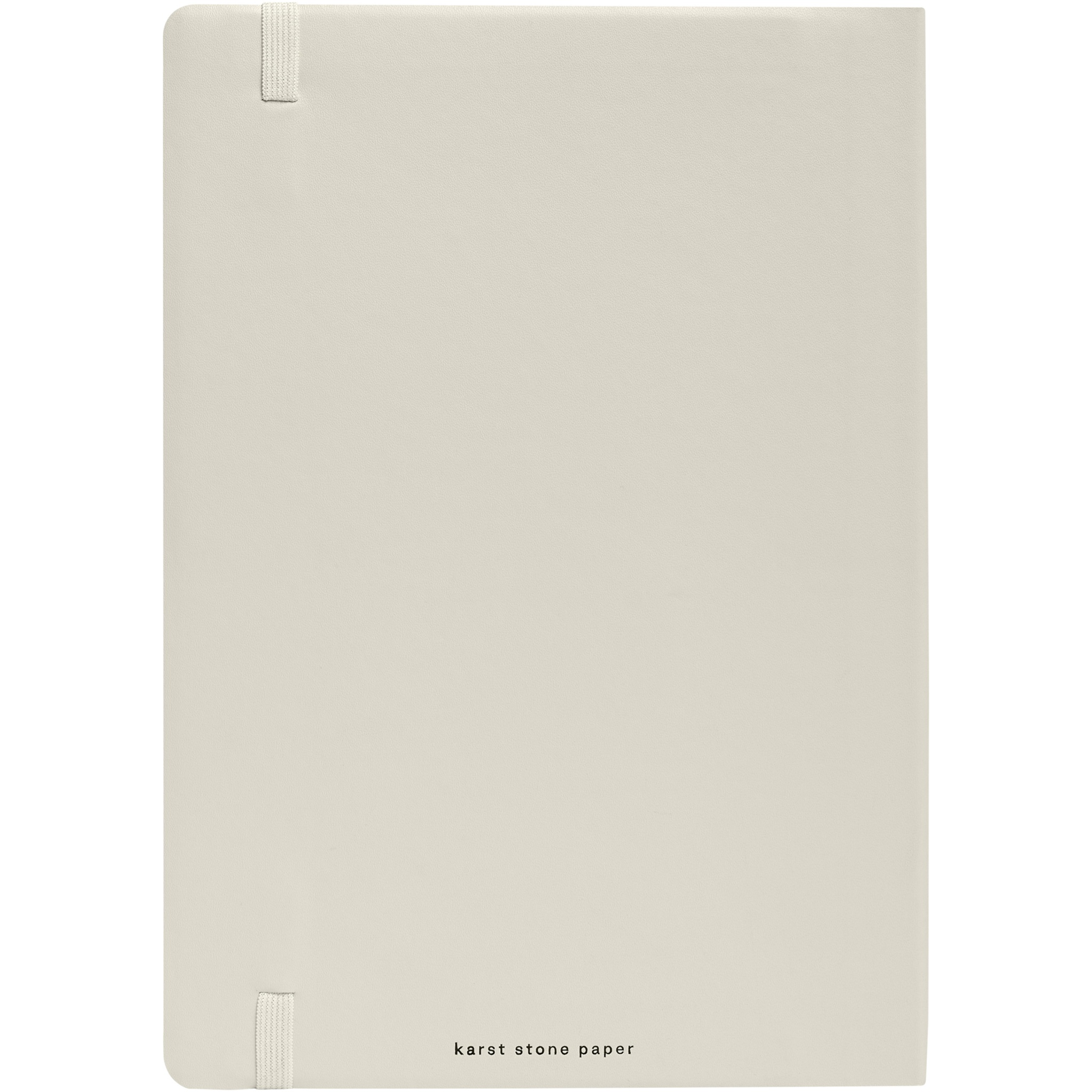 Tämä pehmeäkantinen A5-koon Karst®-muistikirja on Karst®-tuotesarjan ylellisin muistikirja, ja siinä on kestävä ja joustava vegaaninen tekonahkakansi. Sen vettä kestävät kansi ja sivut estävät kosteuden imeytymistä, mistä on apua noutaessasi kahvia kiireisinä aamuina. Kuminauha pitää muistikirjan kiinni, ja kirjassa on 144 vedenpitävää ja repäisynkestävää viivoitettua sivua, laajennettava takatasku säilytystä varten ja merkintänauha, jossa on kuumasaumattu kärki ja pyöristetyt kulmat.