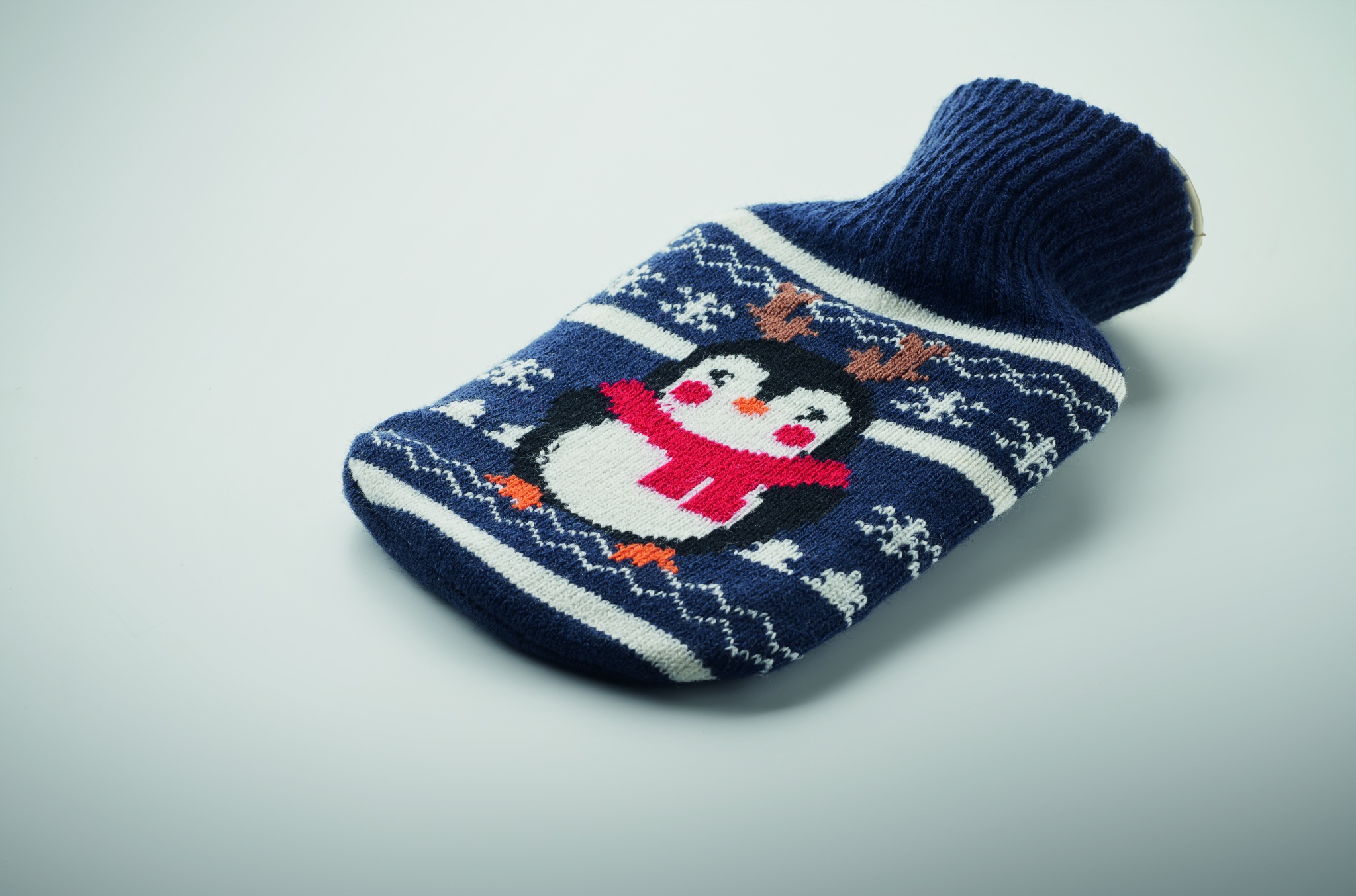Kuumavesipullo, jossa on jouluinen neulepinta. Käytetään lämmön antamiseen, yleensä sängyssä, mutta myös lämmön antamiseen tiettyyn kehon osaan. Tilavuus 250 ml.