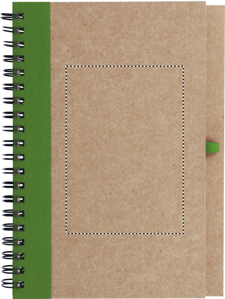 Muistikirja lehtiöllä. 70 sivua kierrätettyä paperia ja kuulakärkikynä valmistettu kierrätyspahvista, biohajoavilla muoviosilla. Sininen muste.