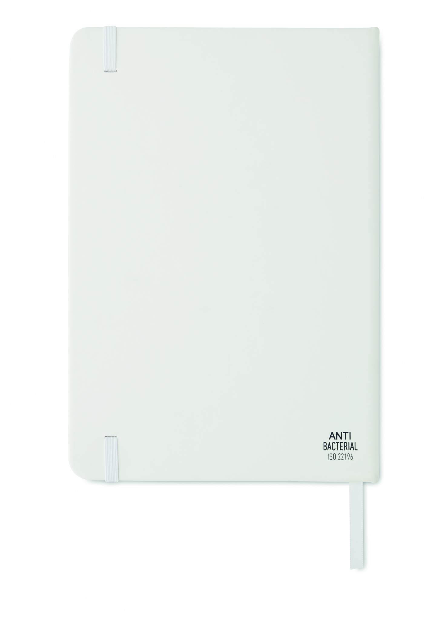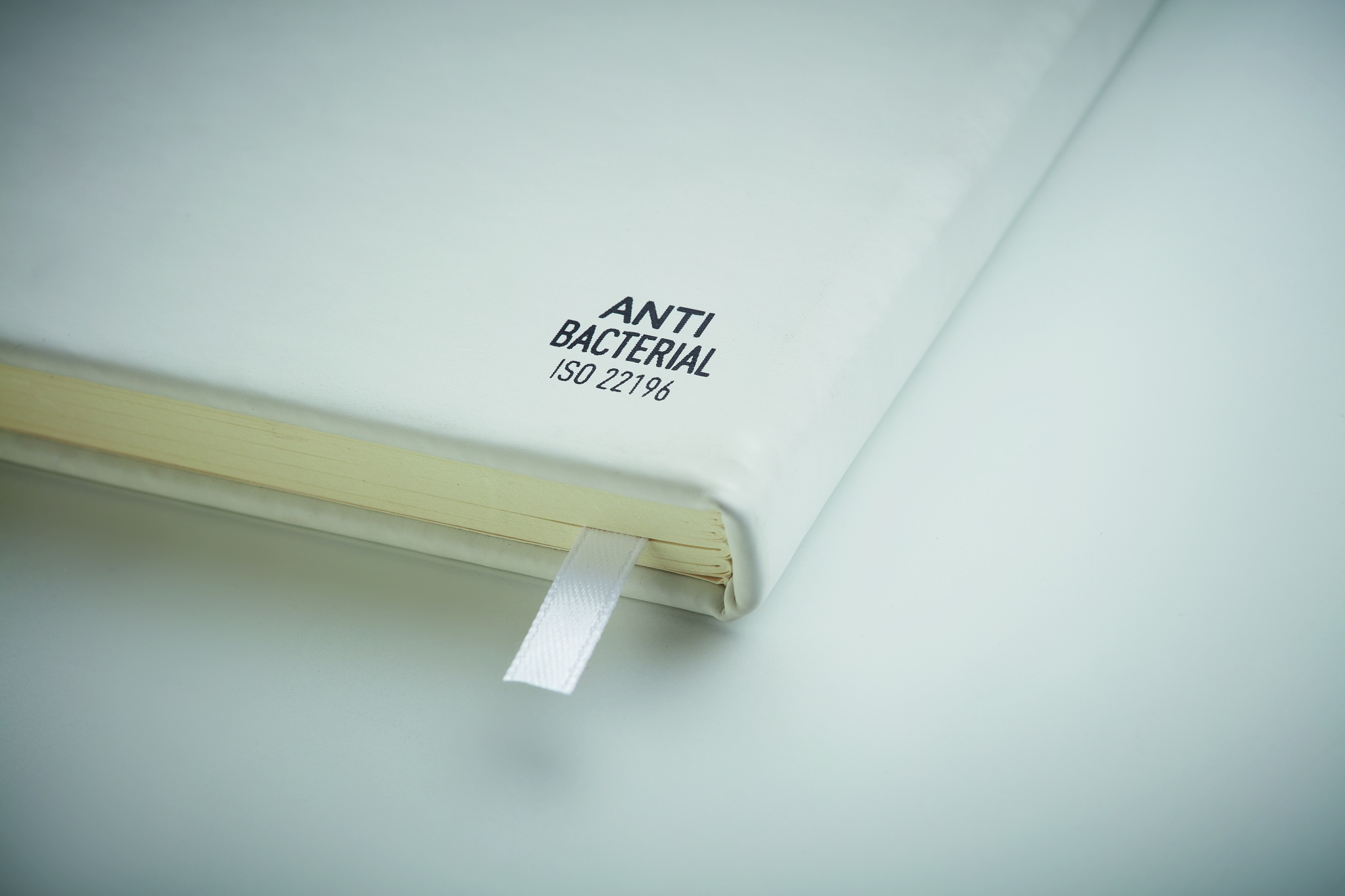 A5 muistikirja jossa on kova PU kannella ja antibakteerisella käsittelyllä. Antibakteerinen käsittely (nano silver) estää bakteerien lisääntymisen tuotteen pinnalla. Sisältää 192 viivattua sivua (96 arkkia) elastisen kuminauhan ja kirjanmerkin. ISO22196