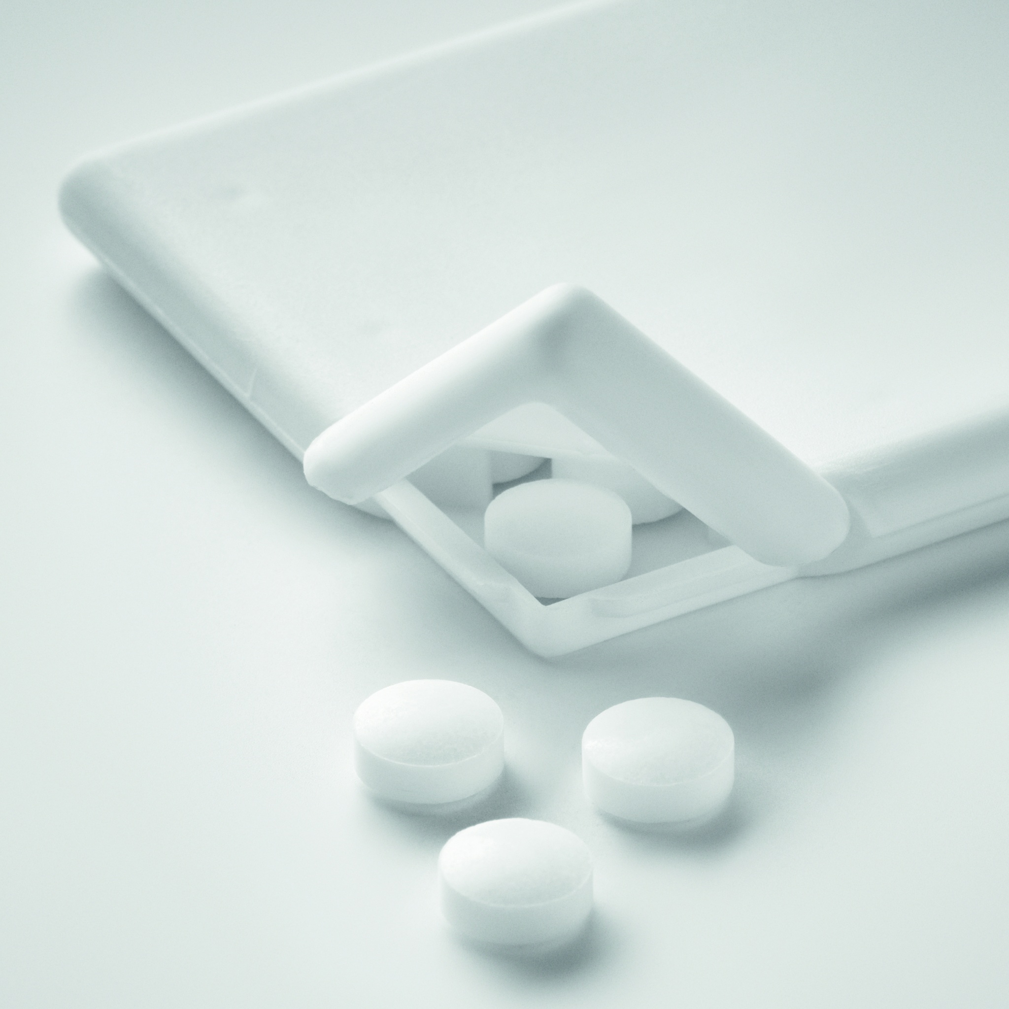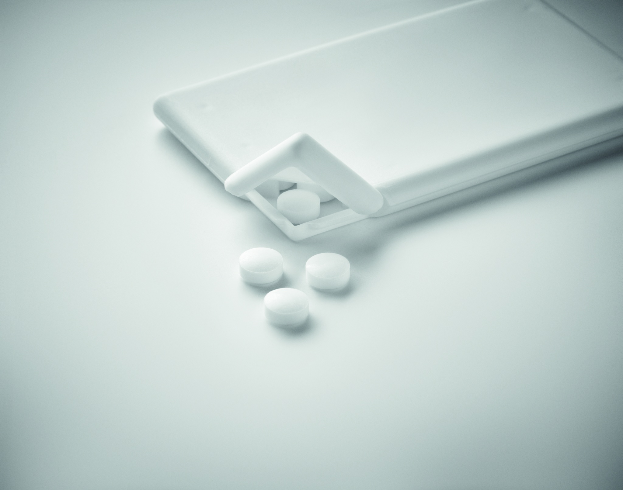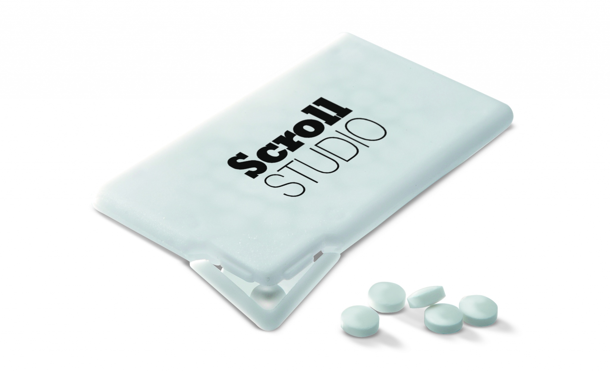 Pastillien annostelija luottokortin muodossa, sisältää 8 grammaa pastilleja.