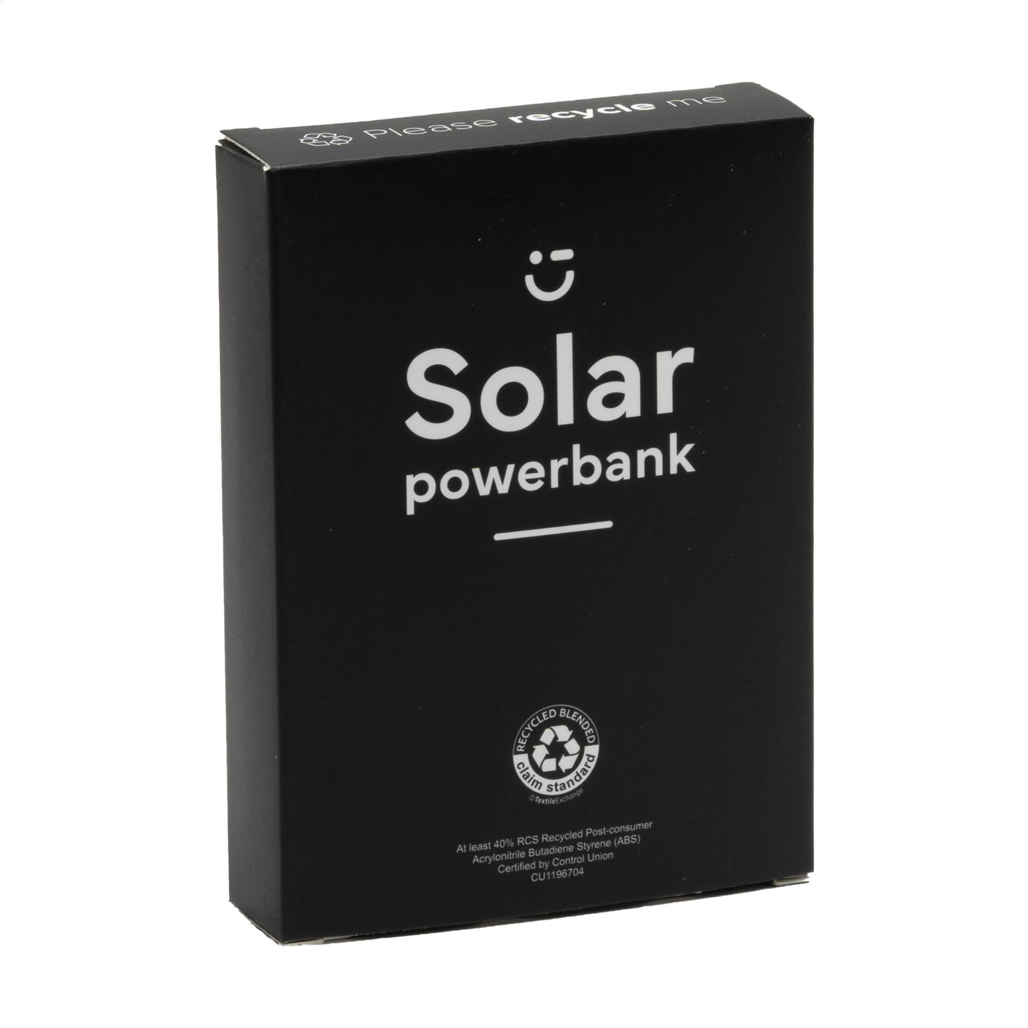 Tehokas, suurikapasiteettinen virtapankki aurinkopaneelilla ja sisäänrakennetulla ladattavalla polymeeriakulla (4000 mAh). Voidaan ladata aurinkoenergialla tai verkkosähköllä (USB-portin avulla). Kotelo on valmistettu kierrätetystä ABS:stä. Tulo: 5V/1A. Lähtö: 5V/1A. Sisältää latauskaapelin USB-C-liitännällä, USB-C-liittimen ja käyttöohjeen. RCS-sertifioitu. Kierrätysmateriaali yhteensä: 40 %. Jokainen tuote on pakattu erikseen.