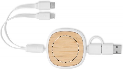 ABS-muovista valmistettu ulosvedettävä USB-latauskaapeli, jossa on bambusta valmistettuja yksityiskohtia. Tulo: 2-in-1 Type-C ja USB-A. Lähtö: C-tyyppi ja 2-in-1 micro USB-B. Kaapelin pituus: 90 cm.