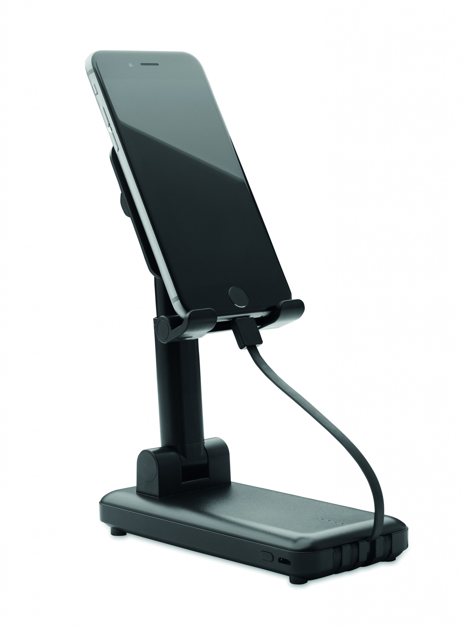 ABS-muovista valmistettu 10000 mAh:n varavirtalähde, jossa on ulosvedettävä ja kokoontaitettava puhelimen pidike. Integroidut monikaapelit. Lähtö: DC 5V/2A.