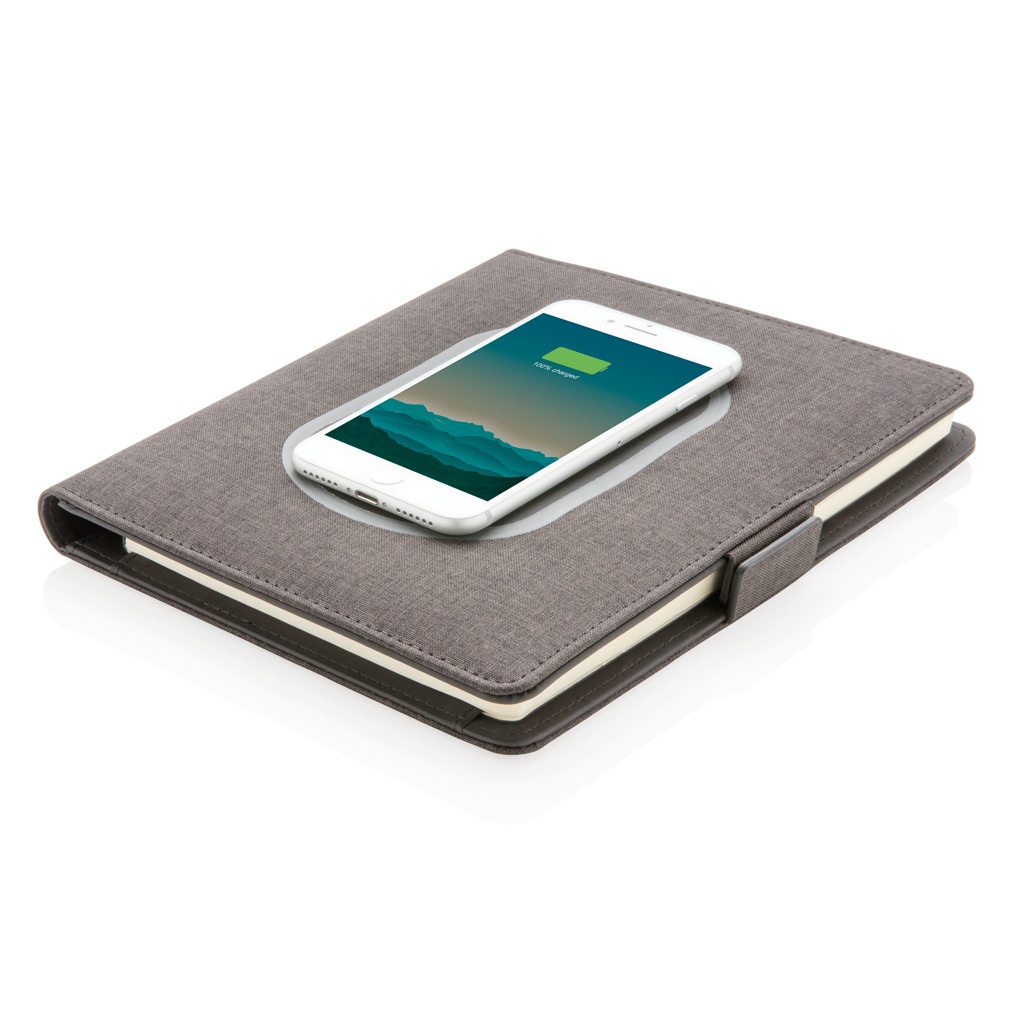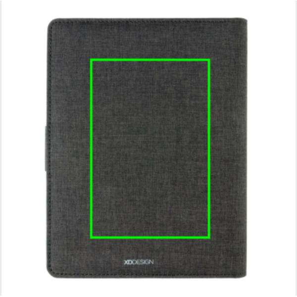 Эта обложка для ноутбука со съемным блокнотом (128 линованных страниц плотностью 80 г/м²) может похвастаться новейшими технологиями. Передняя обложка имеет беспроводную зарядную панель для вашего телефона. (Android последних поколений, iPhone 8 и выше). Старые телефоны и планшеты можно заряжать через порты USB от внешнего аккумулятора емкостью 4000 мА·ч. Уникальные порты USB выдвигаются простым нажатием кнопки. Вход: 5,0 В/1,0 А. Выход: 5,0 В/2,1 А. Беспроводной выход: 5 Вт. Зарегистрированный дизайн®