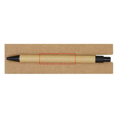 Липкий блокнот с шариковой ручкой. В блокноте 30 листов белой линованной бумаги плотностью 70 г/м2 (8 x 12 см). В комплект также входят 25 разноцветных (5 x 1,2 см) и 25 желтых (7,5 x 7,5 см) клейких листочков, оба типа на бумаге плотностью 70 г/м2. Корпус шариковой ручки изготовлен из переработанной бумаги. Цвет чернил: черный. Длина непрерывной линии: 1000 метров. Размер пера: 1,00 мм.
