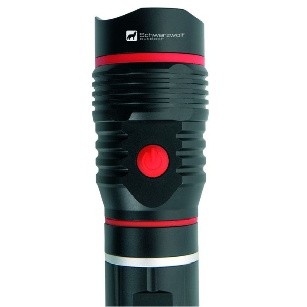 Металлический уличный фонарь Schwarzwolf. Включает в себя диод Cree XPE и выдвижной диод COB, что обеспечивает очень интенсивное освещение. На конце фонаря есть магнит и крючок для подвешивания. Яркость: диод Cree XPE 130 люмен, диод COB 180 люмен. Батарейки 4 × AAA в комплекте.